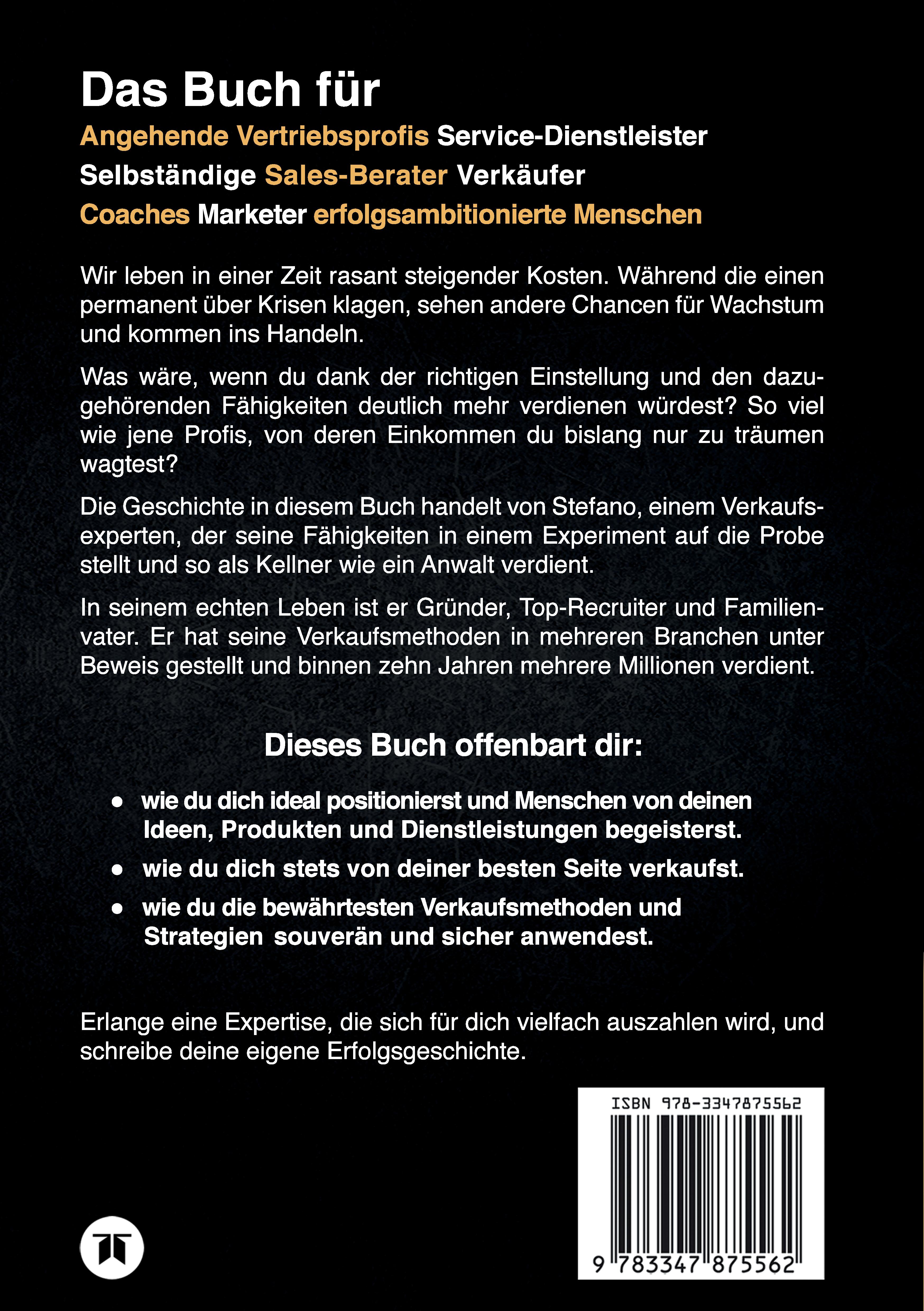 Das Buch über Marketing & Vertrieb, das Verkaufserfolg neu definiert: Entdecke die neuesten Methoden und Strategien im Verkauf und Vertrieb, inklusive den Geheimnissen und Tricks rund um das Thema Verkaufen.Wir leben in einer Zeit, in der Kosten rapide steigen und die Kommunikation bei Verkauf und Vertrieb den Unterschied machen kann. Während einige permanent Krisen sehen, nutzen andere diese Gelegenheiten für Wachstum und bringen sich ins Spiel.Was, wenn du durch das Erlernen effektiver Verkaufspsychologie und dem richtigen Verkaufstraining deinen Gewinn steigern könntest? So viel wie jene Spitzenverkäufer, von denen du bisher nur geträumt hast?Die Erzählung in diesem Buch stellt Stefano vor, einen Vertriebsexperten, der seine Verkaufsmethoden in einem Experiment auf die Probe stellt. Er demonstriert, wie man so erfolgreich Verkäufe abschließt, dass er als Kellner genauso viel verdient wie ein Anwalt.Im wirklichen Leben ist Stefano Gründer, Top-Recruiter und Familienvater. Er hat gezeigt, dass Vertrieb lernen Früchte trägt: Mit seinen erprobten Verkaufsmethoden hat er in verschiedenen Branchen Erfolg gehabt und in einem Zeitraum von zehn Jahren mehrere Millionen erwirtschaftet.Dieses Buch, eines der führenden Bücher im Bereich Verkaufen, wird dir aufschlüsseln:- Wie du dich perfekt positionierst und durch wirksame Verkaufskommunikation Menschen für deine Ideen, Produkte und Dienstleistungen begeisterst.- Wie du dich stets von deiner besten Seite zeigst und richtig verkaufst.- Wie du die erprobtesten und effektivsten Verkaufsmethoden und Strategien souverän und sicher einsetzt.Erlange eine Verkaufsexpertise, die sich für dich vielfach auszahlen wird, und schreibe deine eigene Erfolgsgeschichte im Verkauf. Lerne, wie du erfolgreich verkaufen kannst, mit dem Leitfaden für Verkäufer und nützlichen Tipps für den Verkauf.