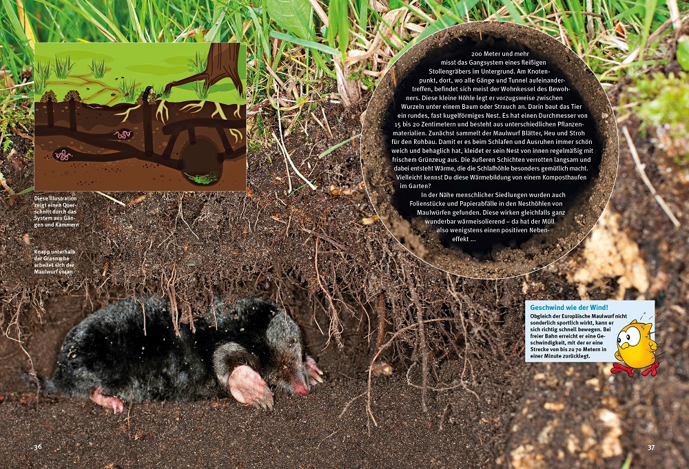 Der Maulwurf fehlt in keiner großen Tierbuchreihe (vgl. "Die große Tierbibliothek", ID-A 45/20, NBB ID-A 50/20). Wie schon bei anderen Titeln der Reihe (vgl. Spatzen ID-A 29/22), gelingt es auch hier, Spannendes und Erstaunliches zu einem eher unscheinbaren Tier anschaulich zu beschreiben: Reihenüblich werden alle wesentlichen Aspekte wie Verbreitung, Lebensraum, Nahrung, Anatomie, Verhalten, Gefährdungen etc. reich bebildert auf Fotoseiten erörtert und mit dem abschließenden Quiz abgefragt. Viele Details etwa zu den perfekten Anpassungen an das Leben in unterirdischen Gängen wecken Sympathie für die eher nützlichen als schädlichen Mitbewohner. Da sie mit ihren aufgeworfenen Erdhaufen dennoch nicht überall willkommen sind, fehlen auch einige Tipps zur "sanften Vergrämung" der talentierten Tunnelgräber nicht, etwa zum Schutz von empfindlichen Nutzpflanzen oder zur Pflege eines Sportplatzes. Das sollten aber auch die einzigen Gründe der Vertreibung bleiben. Die anderen Kapitel sprechen eher für wohlwollende Nachbarschaft. Zur Ergänzung gern überall.