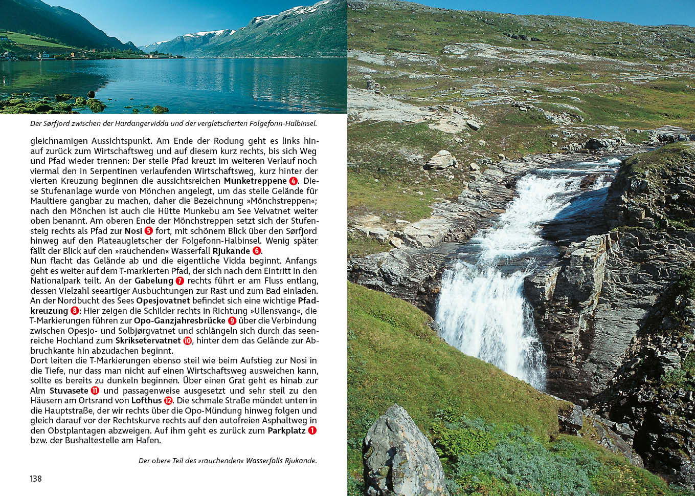 Die Auswahl der Touren ist breit gefächert und bietet für jeden Geschmack und jede Kondition etwas. Familienfreundliche Wanderungen finden sich darunter ebenso wie anspruchsvolle Gipfelanstiege und mehrtägige Hüttentouren. Die Tourenauswahl zeigt die Vielfalt des südlichen Norwegens, führt den Wanderer zu viel besuchten Glanzpunkten und lässt ihn auch stille Ecken kennenlernen. Von der Skagerrakküste bei Kristiansand spannt sich der Bogen zu den Heidehochflächen und Aussichtsbergen in Telemark, Valdres und über dem Gudbrandsdalen. Erstklassige Wanderungen führen durch die Felsszenerien in Rogaland und am Sognefjord. Die Nationalparks Langsua, Folgefonna und Hardangervidda bieten Panoramakuppen und Seen - eine Umgebung, die an Abwechslung und landschaftlicher Schönheit keinen Wunsch offen lässt.