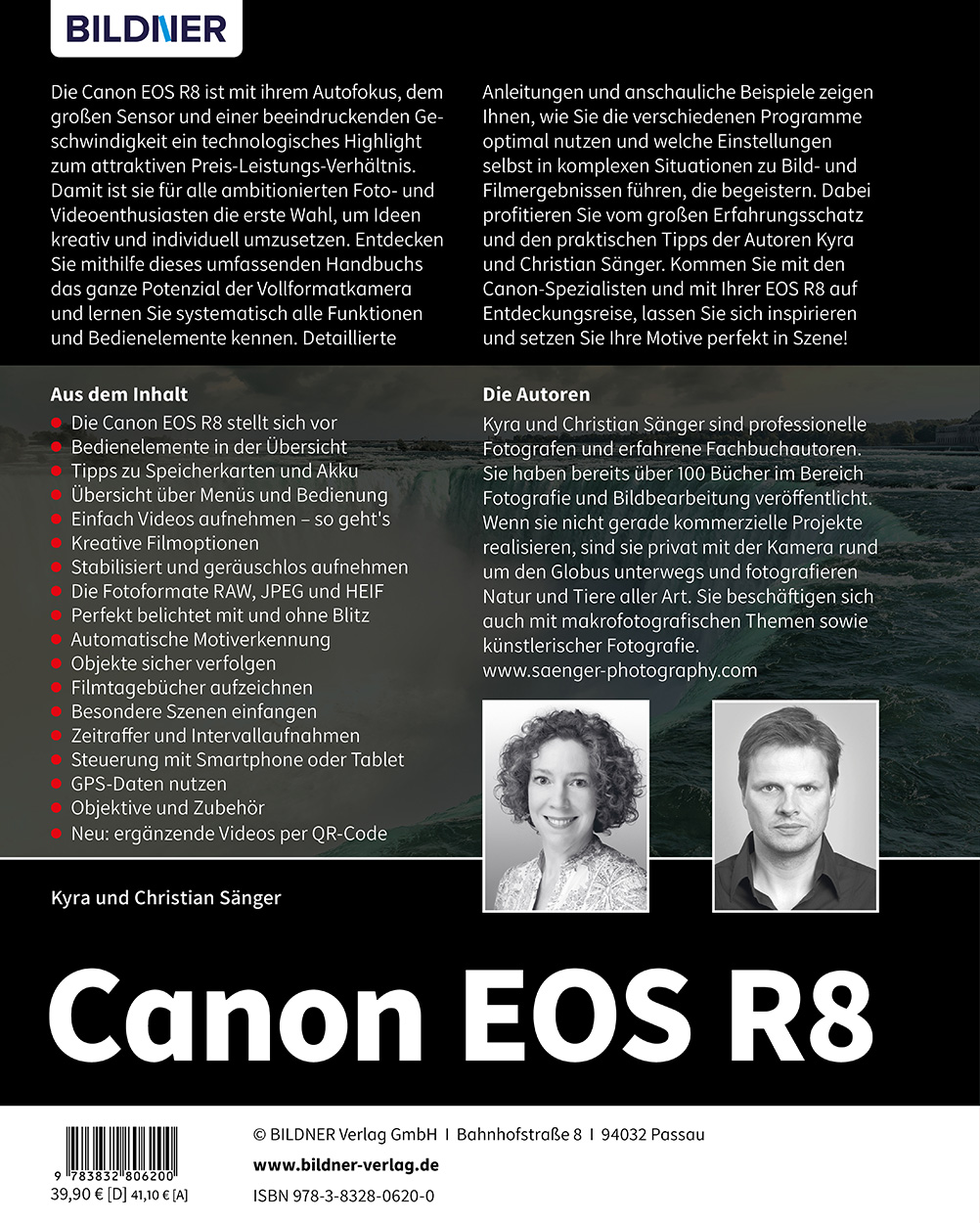 Die Canon EOS R8 ist mit ihrem Autofokus, dem großen Sensor und einer beeindruckenden Geschwindigkeit ein technologisches Highlight zum attraktiven Preis-Leistungs-Verhältnis. Damit ist sie für alle ambitionierten Foto- und Videoenthusiasten die erste Wahl, um Ideen kreativ und individuell umzusetzen. Entdecken Sie mithilfe dieses umfassenden Handbuchs das ganze Potenzial der Vollformatkamera und lernen Sie systematisch alle Funktionen und Bedienelemente kennen. Detaillierte Anleitungen und anschauliche Beispiele zeigen Ihnen, wie Sie die verschiedenen Programme optimal nutzen und welche Einstellungen selbst in komplexen Situationen zu Bild- und Filmergebnissen führen, die begeistern. Dabei profitieren Sie vom großen Erfahrungsschatz und den praktischen Tipps der Autoren Kyra und Christian Sänger. Kommen Sie mit den Canon-Spezialisten und mit Ihrer Canon EOS R8 auf Entdeckungsreise, lassen Sie sich inspirieren und setzen Sie Ihre Motive perfekt in Szene!