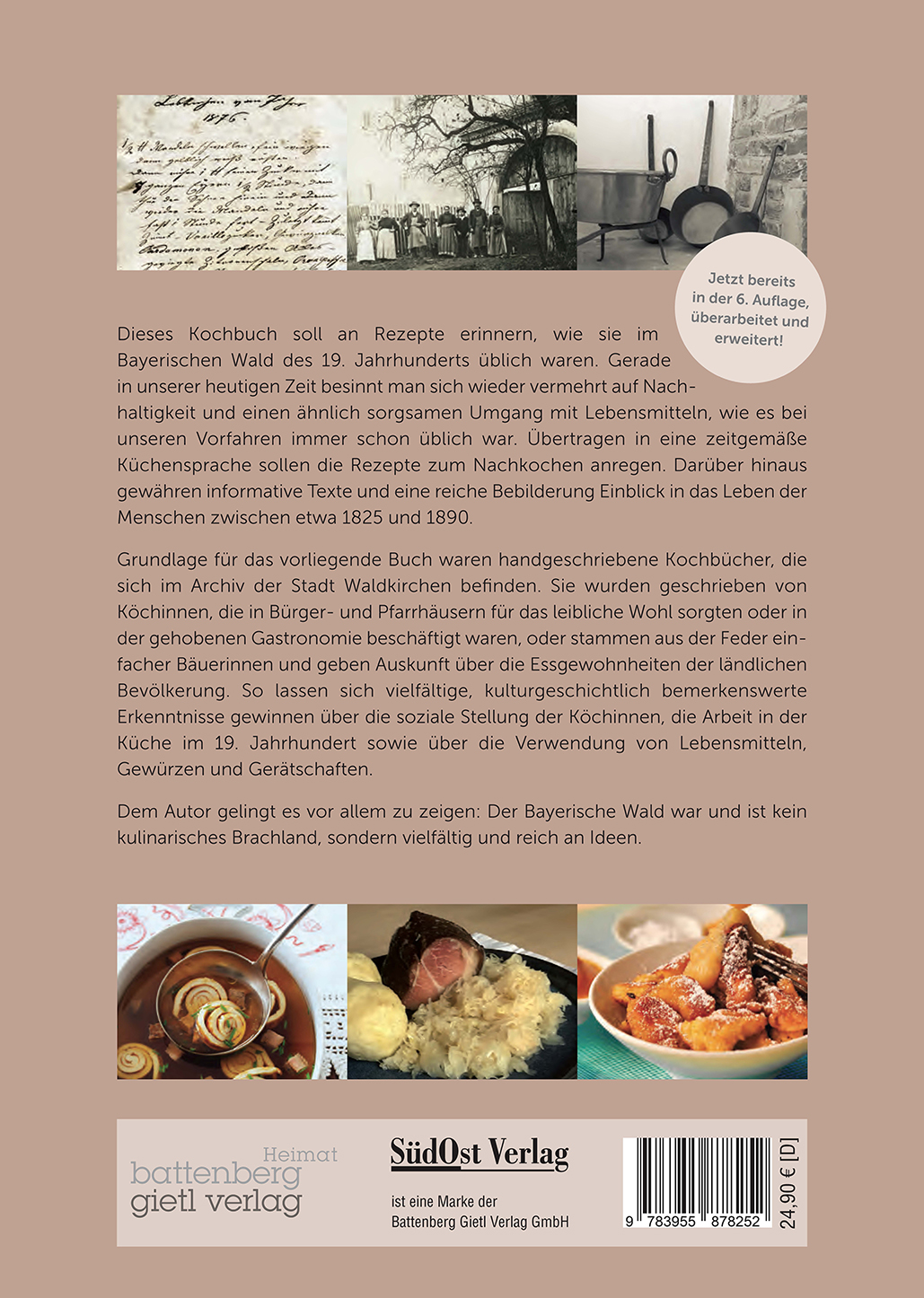 Dieses Kochbuch soll an Rezepte erinnern, wie sie im Bayerischen Wald des 19. Jahrhunderts üblich waren. Gerade in unserer heutigen Zeit besinnt man sich wieder vermehrt auf Nachhaltigkeit und einen ähnlich sorgsamen Umgang mit Lebensmitteln, wie es bei unseren Vorfahren immer schon üblich war. Übertragen in eine zeitgemäße Küchensprache sollen die Rezepte zum Nachkochen anregen. Darüber hinaus gewähren informative Texte und eine reiche Bebilderung Einblick in das Leben der Menschen zwischen etwa 1825 und 1890. Grundlage für das vorliegende Buch waren handgeschriebene Kochbücher, die sich im Archiv der Stadt Waldkirchen befinden. Sie wurden geschrieben von Köchinnen, die in Bürger- und Pfarrhäusern für das leibliche Wohl sorgten oder in der gehobenen Gastronomie beschäftigt waren, oder stammen aus der Feder einfacher Bäuerinnen und geben Auskunft über die Essgewohnheiten der ländlichen Bevölkerung. So lassen sich vielfältige, kulturgeschichtlich bemerkenswerte Erkenntnisse gewinnen über die soziale Stellung der Köchinnen, die Arbeit in der Küche im 19. Jahrhundert sowie über die Verwendung von Lebensmitteln, Gewürzen und Gerätschaften. Dem Autor gelingt es vor allem zu zeigen: Der Bayerische Wald war und ist kein kulinarisches Brachland, sondern vielfältig und reich an Ideen.