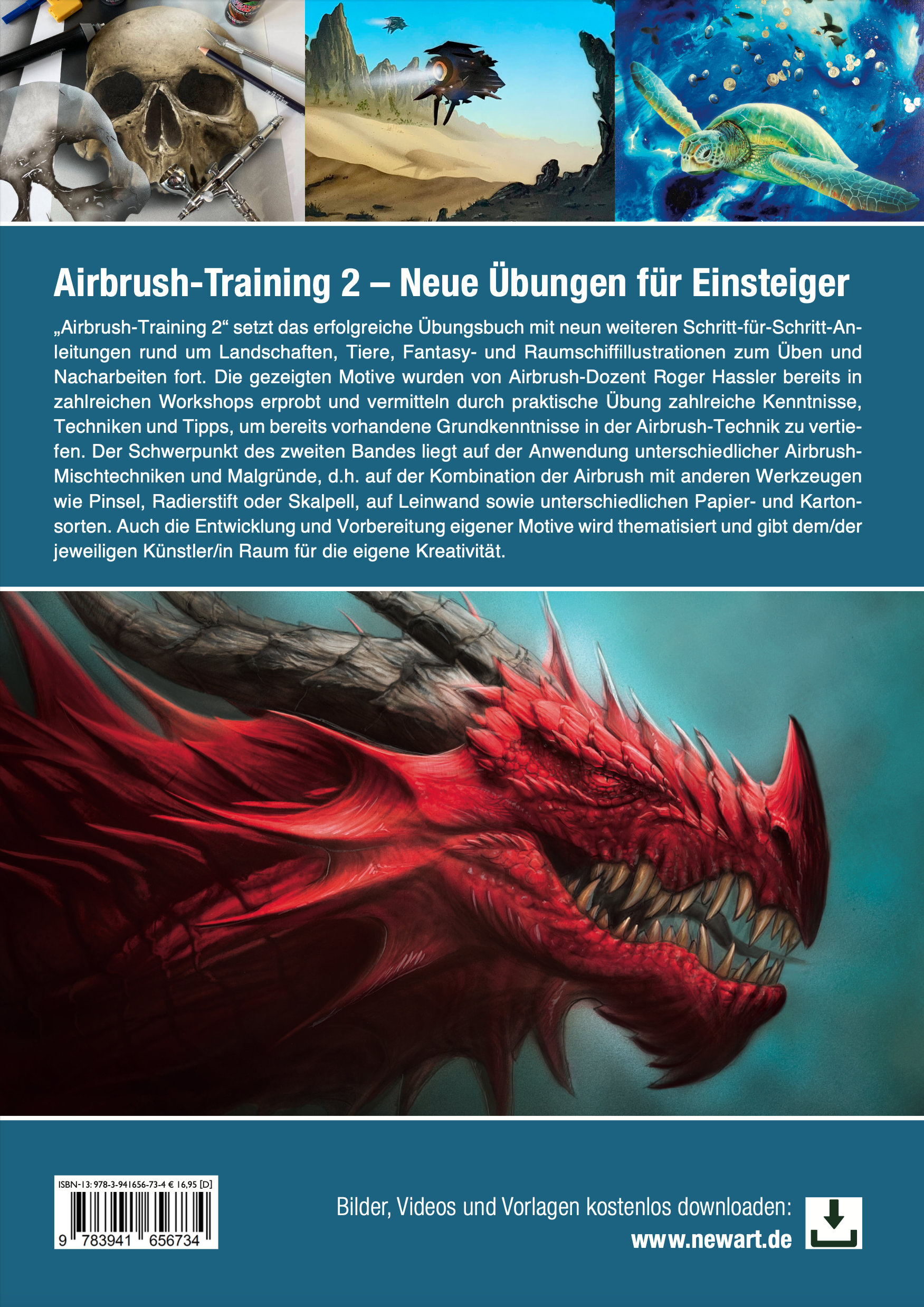 Airbrush-Training 2 - Neue Übungen für Einsteiger"Airbrush-Training 2" setzt das erfolgreiche Übungsbuch mit neun weiteren Schritt-für-Schritt-Anleitungen rund um Landschaften, Tiere, Fantasy- und Raumschiffillustrationen zum Üben und Nacharbeiten fort. Die gezeigten Motive wurden von Airbrush-Dozent Roger Hassler bereits in zahlreichen Workshops erprobt und vermitteln durch praktische Übung zahlreiche Kenntnisse, Techniken und Tipps, um bereits vorhandene Grundkenntnisse in der Airbrush-Technik zu vertiefen. Der Schwerpunkt des zweiten Bandes liegt auf der Anwendung unterschiedlicher Airbrush-Mischtechniken und Malgründe, d.h. auf der Kombination der Airbrush mit anderen Werkzeugen wie Pinsel, Radierstift oder Skalpell, auf Leinwand sowie unterschiedlichen Papier- und Kartonsorten. Auch die Entwicklung und Vorbereitung eigener Motive wird thematisiert und gibt dem/der jeweiligen Künstler/in Raum für die eigene Kreativität.