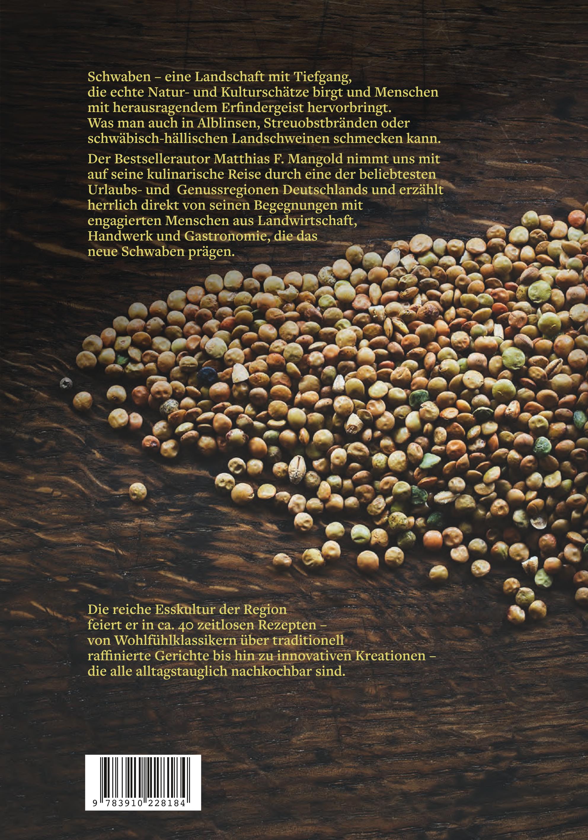 Matthias F. Mangold, weit gereister Kochbuchautor, erzählt von seiner kulinarischen Reise durch Schwaben. Er besucht Produzenten, die neue Wege beschreiten, und stellt kreative gastronomische Projekte vor. Nebenbei wirft er einen Blick auf die schwäbische Landschaft, die Menschen, Produkte und ihre Rezepte prägt. Mit den sorgfältig ausgewählten Rezepten lässt sich das Gefühl auch zu Hause erleben.