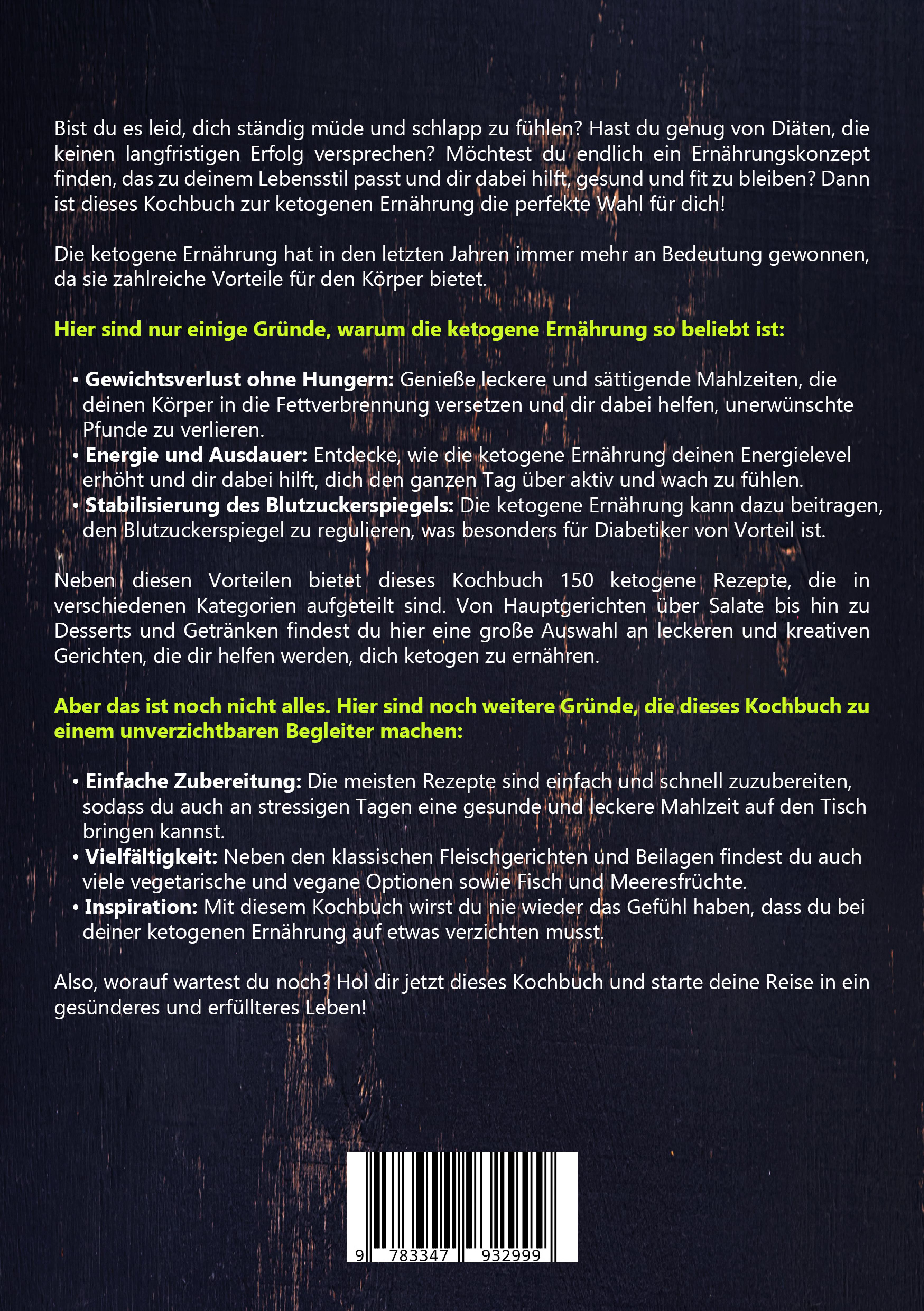 Bist du es leid, dich ständig müde und schlapp zu fühlen? Hast du genug von Diäten, die keinen langfristigen Erfolg versprechen? Möchtest du endlich ein Ernährungskonzept finden, das zu deinem Lebensstil passt und dir dabei hilft, gesund und fit zu bleiben?Dann ist dieses Kochbuch zur ketogenen Ernährung die perfekte Wahl für dich!Die ketogene Ernährung hat in den letzten Jahren immer mehr an Bedeutung gewonnen, da sie zahlreiche Vorteile für den Körper bietet. Hier sind nur einige Gründe, warum die ketogene Ernährung so beliebt ist:- Reduzierung von Entzündungen: Eine ketogene Ernährung kann helfen, Entzündungen im Körper zu reduzieren, was wiederum das Risiko von chronischen Erkrankungen wie Diabetes, Herzkrankheiten und Krebs verringern kann.- Gewichtsverlust ohne Hungern: Genieße leckere und sättigende Mahlzeiten, die deinen Körper in die Fettverbrennung versetzen und dir dabei helfen, unerwünschte Pfunde zu verlieren.- Energie und Ausdauer: Entdecke, wie die ketogene Ernährung deinen Energielevel erhöht und dir dabei hilft, dich den ganzen Tag über aktiv und wach zu fühlen.- Stabilisierung des Blutzuckerspiegels: Die ketogene Ernährung kann dazu beitragen, den Blutzuckerspiegel zu regulieren, was besonders für Diabetiker von Vorteil ist.- Stärkung des Immunsystems: Unterstütze dein Immunsystem und beuge Krankheiten vor, indem du deinen Körper mit den richtigen Nährstoffen versorgst.Neben diesen Vorteilen bietet dir dieses Kochbuch 150 abwechslungsreiche ketogene Rezepte, die in verschiedenen Kategorien aufgeteilt sind. Von Hauptgerichten über Salate bis hin zu Desserts und Getränken findest du hier eine große Auswahl an leckeren und kreativen Gerichten, die dir helfen werden, dich ketogen zu ernähren.Aber das ist noch nicht alles. Hier sind noch weitere Gründe, die dieses Kochbuch zu einem unverzichtbaren Begleiter machen:- Einfache Zubereitung: Die meisten Rezepte sind einfach und schnell zuzubereiten, sodass du auch an stressigen Tagen eine gesunde und leckere Mahlzeit auf den Tisch bringen kannst.- Vielfältigkeit: Neben den klassischen Fleischgerichten und Beilagen findest du auch viele vegetarische und vegane Optionen sowie Fisch und Meeresfrüchte.- Inspiration: Mit diesem Kochbuch wirst du nie wieder das Gefühl haben, dass du bei deiner ketogenen Ernährung auf etwas verzichten musst.Also, worauf wartest du noch? Hol dir jetzt dieses Kochbuch und starte deine Reise in ein gesünderes und erfüllteres Leben!