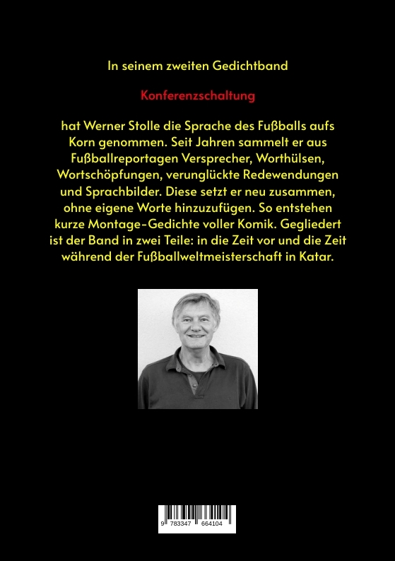 Werner Stolle, 1951 in Kiel geboren, arbeitete als Lehrer in Bad Oldesloe, in Moskau und anschließend bis zu seiner Pensionierung in Bad Segeberg. Das Schreiben ist neben der Fotografie sein zweites großes Hobby. Er verfasst Gedichte, Kurzprosa, Dialoge und Montagetexte, meist mit ironisch-kritischem Unterton. Einige seiner Texte erschienen in den Anthologien "Unser Paradies" (2020) und "HerbstZeitLos" (2022), herausgegeben von der Segeberger Autorengruppe.Im Jahre 2021 veröffentliche er sein umfangreiches autobiografischse Werk "Remont - Drei Jahre in Moskau", eine Rückschau auf seinen Moskau-Aufenthalt von 1989-1992. Im Jahr darauf folgte mit "Ganz unverhofft ein Hai" der erste Gedichtband .Mit "Konferenschaltung - Ein Sprachdebakel" erscheint nun sein Buch mit Montage-Gedichten zum Thema Fußball. In den vergangenen Jahren hat Stolle seine Fotos auf verschiedenen Ausstellungen präsentiert.