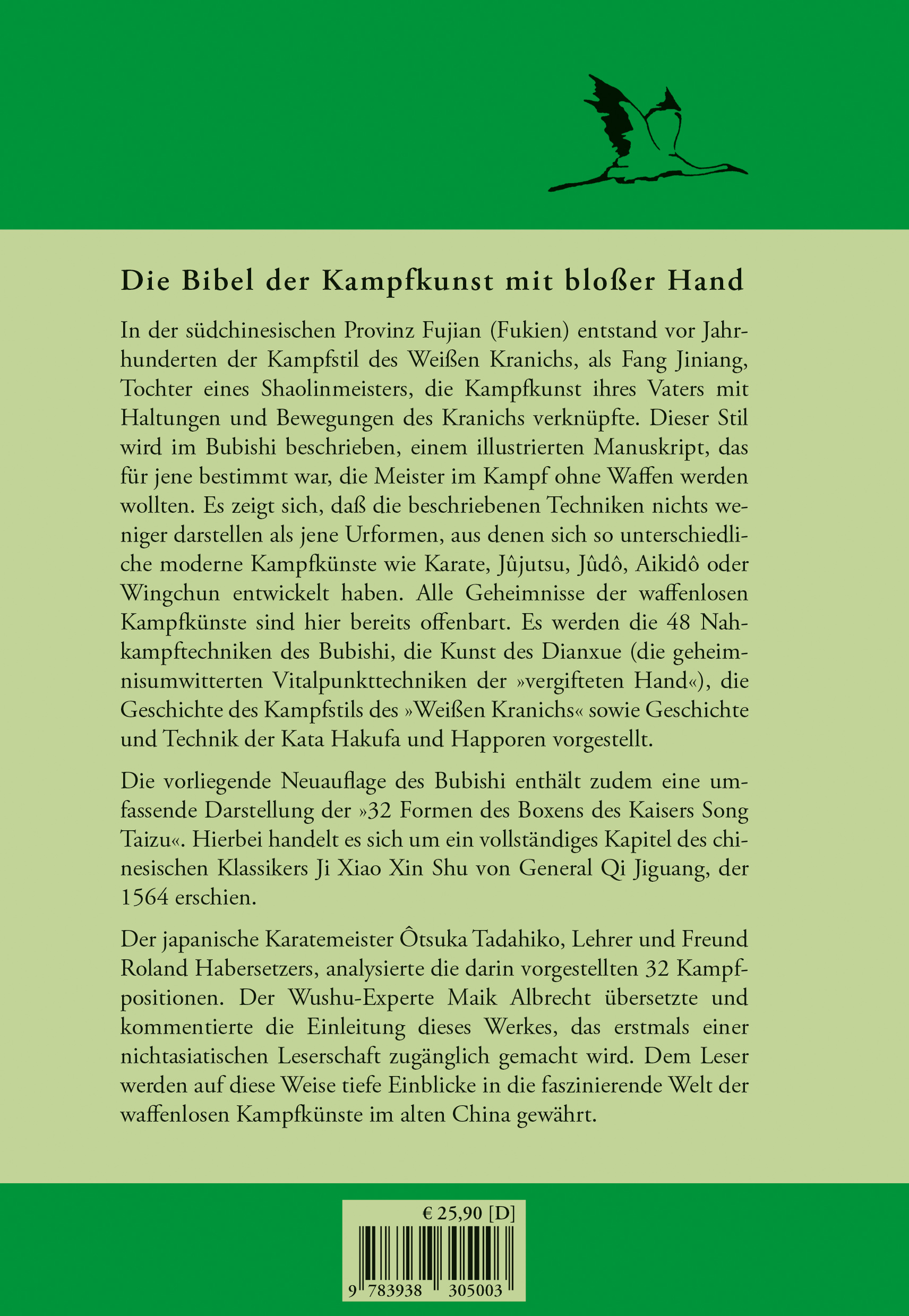 Die Bibel der Kampfkunst mit bloßer HandIn der südchinesischen Provinz Fujian (Fukien) entstand vor Jahrhunderten der Kampfstil des Weißen Kranichs, als Fang Jin Jang, Tochter eines Shaolinmeisters, die Kampfkunst ihres Vaters mit Haltungen und Bewegungen des Kranichs verknüpfte. Dieser Stil wird im Bubishi beschrieben, einem illustrierten Manuskript, das für jene bestimmt war, die Meister im Kampf ohne Waffen werden wollten.Es zeigt sich, daß die im Bubishi beschriebenen Techniken nichts weniger darstellen als jene Urformen, aus denen sich so unterschiedliche moderne Kampfkünste wie Karate, Jûjutsu, Jûdô, Aikidô oder Wingchun entwickelt haben. Alle Geheimnisse der waffenlosen Kampfkünste sind hier bereits offenbart.In diesem Werk werden die 48 Nahkampftechniken des Bubishi (ergänzt durch ausführliche Kommentare und detaillierte Zeichnungen des Autors), die Kunst des Dianxue (die geheimnisumwitterten Vitalpunkttechniken der "vergifteten Hand"), die Geschichte des Kampfstils des "Weißen Kranichs" sowie Geschichte und Technik der Kata Hakufa und Happoren vorgestellt.Die vorliegende Neuauflage des Bubishi enthält zudem eine umfassende Darstellung der "32 Formen des Boxens des Kaisers Song Taizu". Hierbei handelt es sich um ein vollständiges Kapitel des chinesischen Klassikers Ji Xiao Xin Shu von General Qi Jiguang, der 1564 erschien.Der japanische Karatemeister Ôtsuka Tadahiko, Lehrer und Freund Roland Habersetzers, analysiert die darin vorgestellten 32 Kampfpositionen. Der in China lebende Wushu-Experte Maik Albrecht übersetzte und kommentierte die Einleitung dieses Werkes, das erstmals einer nichtasiatischen Leserschaft zugänglich gemacht wird. Maik Albrecht, der bei einigen der größten lebenden Meister des Wushu (Kungfu) in die Lehre gegangen ist und chinesische Sprache und Kultur studiert hat, hat es vollbracht, den klassischen Text auf eine Weise zu übertragen und zu erläutern, daß der Leser tiefe Einblicke in die faszinierende Welt der waffenlosen Kampfkünste im alten China gewinnt.
