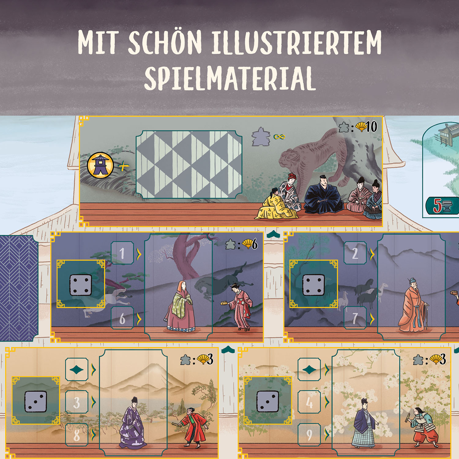 Knackiges Kennerspiel mit neun schön verzahnten Spielzügen pro Person. Wunderschön gestaltetes Spielmaterial. Mit neun Spielrunden in ca. 50-70 Minuten gespielt. Besonderer Würfeleinsetz-Mechanismus. Mit Solo-Spielvariante. Ein Brettspiel mit hohem Wiederspielwert! Für 1-4 Spieler ab 12 Jahren. Japan, 1761: Fürst Daimyo ist ein wichtiger Berater des mächtigen Shogunats. Wer kann die Gunst des Fürsten für sich gewinnen? Ein bis vier Spielerinnen und Spieler ab 12 Jahren schlüpfen in die Rolle der auf Burg Himeji lebenden Familien. In neun schön verzahnten Spielzügen suchen sie die passenden Würfel aus und setzen ihre Ressourcen geschickt ein. Gelingt es ihnen, eigene Familienmitglieder in einflussreiche Positionen zu bringen? Um ihren Sieg zu erringen bewegen sie sich auf Übungsplätzen, in Gärten und in der Burg. Ein stimmungsvolles Kennerspiel mit neun Spielrunden - inklusive Solo-Spielvariante.