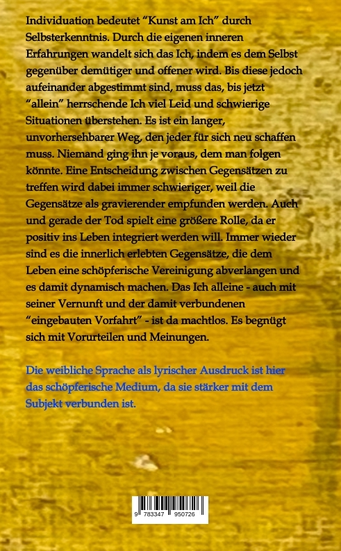 Das vorliegende lyrische Werk beschreibt den Prozess einer Selbst-Werdung, in diesen Verlauf sich das eigene Bewusstsein in seiner Individualität bzw. der Unterschiedenheit von anderen zunehmend verfestigt. Individuation ist das Gegenstück zur fernöstlichen Persönlichkeitsentwicklung; mit dem Unterschied, dass man sich nicht in einer vorgefertigten Religion befindet, sondern völlig frei schwebt und sein eigenes "Haus" baut, in dem man innerlich wohnt. Hierzu ist es erforderlich, den Mut zu haben sich nicht in vorgefertigte "Häuser" zu begeben, sondern seinen eigenen Gedanken und Gefühlen freien Lauf lässt und so sein "Haus" entstehen lässt. Lebt man in seinem Selbst, kann man die Türen und Fenster zur Welt hin öffnen und alles ein und ausfließen lassen ohne daran zu zerbrechen. Dies bedeutet nicht das bloße Ausleben seiner Ichbezogenheit, sondern es geht um den ganzen Menschen, der ein moralisches Empfinden hat und dadurch auch das Andere in seine Überlegungen einbezieht. Der 'Beginn einer langen Reise', wie der Werdegang auf dem Titelblatt bezeichnet wird, ist der Beginn einer weiblichen Philosophie, die sich aus dem individuellen Erleben entwickelt und immer tiefer aus sich heraus entfaltet. Bei der zunehmenden Vermassung des Geistes, mit seinem Ausdruck im Ich, wird der Mut zur Individuation, "der Kunst am Ich" und damit zum selbständigen Leben und Denken immer notwendiger. Das Geschriebene soll den Leser ermutigen seinen Weg und seine eigenen Erkenntnisse zu finden. So ist es doch meist die Kunst, die dem Menschen einen gewissen Freiraum zur Selbstäußerung ermöglicht. Nur das hier die Selbstäußerung notwendig mit Selbsterkenntnis verbunden ist und diese Erkenntnis ist es auch, die den Einzelnen von seiner aufgesetzten Maske befreit. Denn er erkennt nun, wer er wirklich ist, mit all seinen guten und schlechten Eigenschaften. Im Gegensatz zu dem, der er durch das Annehmen von äußeren als erstrebenswert auferlegten Vorgaben der Masse (sein "falsches Ich"), gerne sein wollte oder musste.