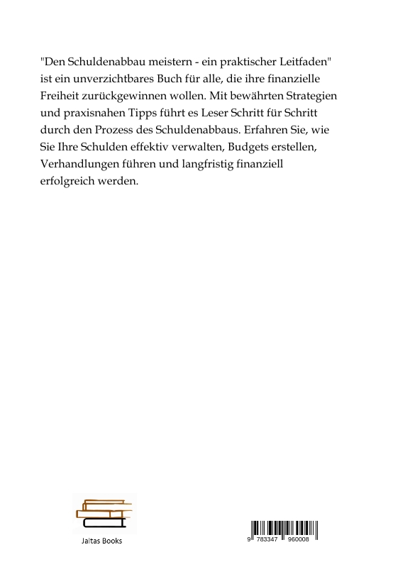 "Den Schuldenabbau meistern - ein praktischer Leitfaden" ist ein unverzichtbares Buch für alle, die ihre finanzielle Freiheit zurückgewinnen wollen. Mit bewährten Strategien und praxisnahen Tipps führt es Leser Schritt für Schritt durch den Prozess des Schuldenabbaus. Erfahren Sie, wie Sie Ihre Schulden effektiv verwalten, Budgets erstellen, Verhandlungen führen und langfristig finanziell erfolgreich werden.