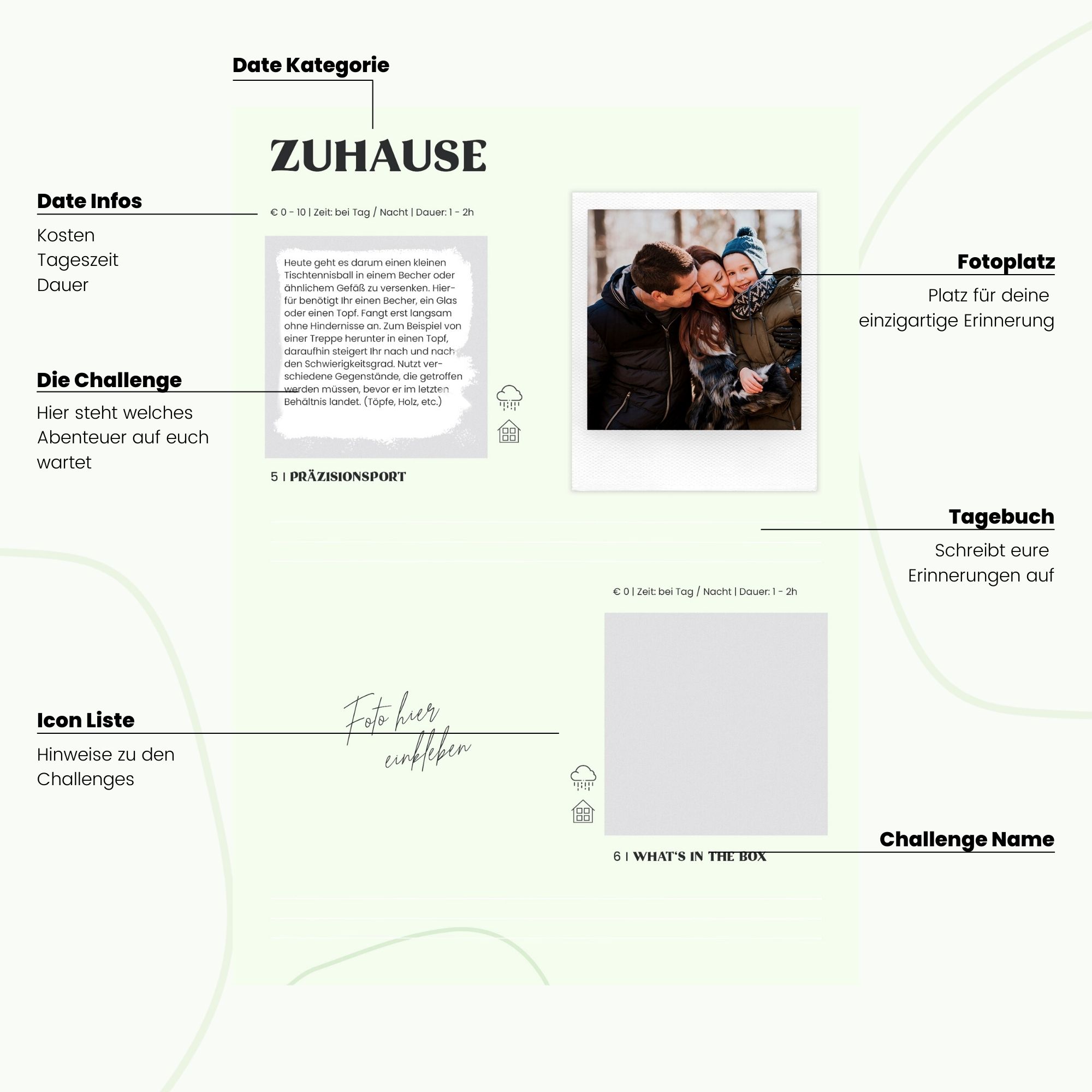 In unserem Challengebuch für Familien findet ihr 32 einzigartige und aufregende Aufgaben, die euch und eure Familie herausfordern und für unvergessliche Abenteuer sorgen werden. Jede Aufgabe wurde speziell für Familien konzipiert und ist eine Gelegenheit, eure Bindung zu stärken und gemeinsam als Familie zu wachsen. Von kreativen Aktivitäten bis hin zu Abenteuern im Freien - unser Buch bietet für jeden Geschmack die passende Challenge.