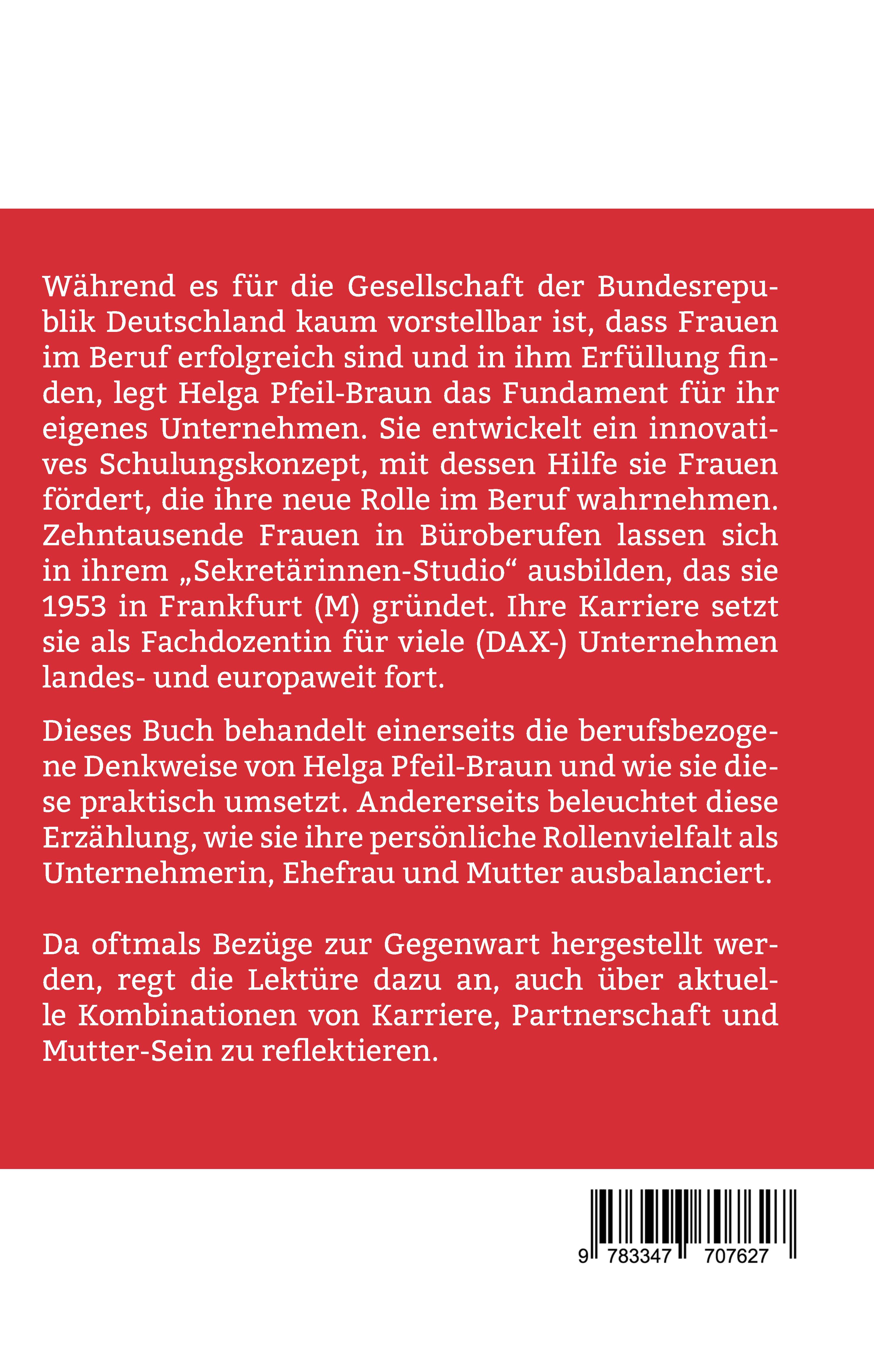 Geprägt von einer ungewollten Erziehung im Nationalsozialismus und traumatisiert von kriegsbedingten Ereignissen, steht eine junge Frau 1945 vor den Scherben ihres Lebens. Trotz dieser verheerenden Ausgangslage gelingt es ihr aus eigener Kraft ein erfolgreiches Unternehmen in der Aus- und Weiterbildung aufzubauen. Mit ihrem innovativen Schulungskonzept führt sie eine jahrzehntelange kontinuierliche Förderung von Frauen in Büroberufen durch, sowohl bundesweit als auch innerhalb Europas.Dieses Buch behandelt einerseits die berufsbezogene Denkweise der Protagonistin und wie sie diese praktisch umsetzt. Andererseits beleuchtet diese Erzählung, wie sie ihre Rollenvielfalt als Unternehmerin, Ehefrau und Mutter ausbalanciert.Da oftmals Bezüge zur Gegenwart hergestellt werden, regt die Lektüre dazu an, auch über aktuelle Kombinationen von Karriere, Partnerschaft und Mutter-Sein zu reflektieren.