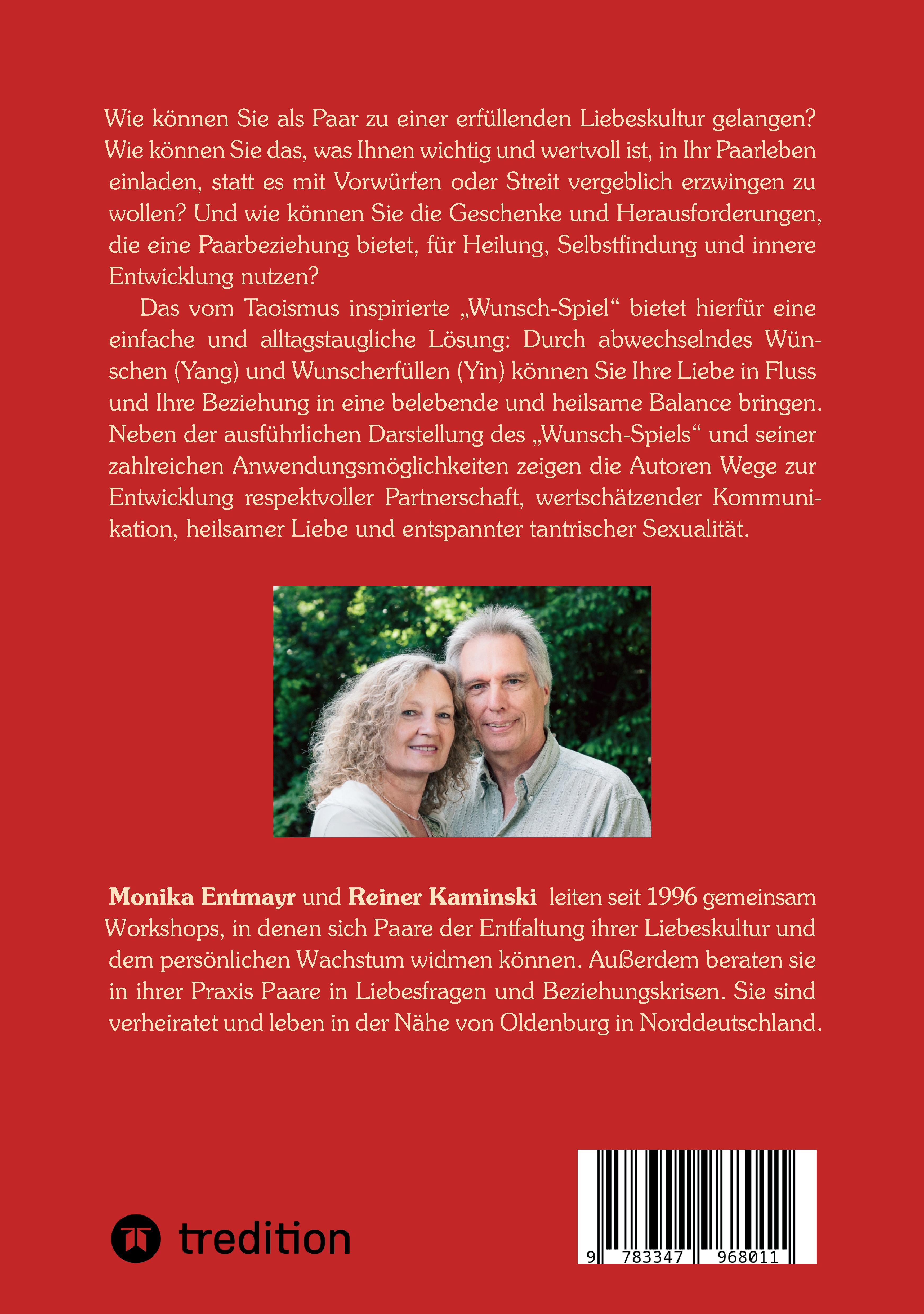 Monika Entmayr und Reiner Kaminski leiten seit 1996 gemeinsam Workshops, in denen sich Paare der Entfaltung ihrer Liebeskultur und dem persönlichen Wachstum widmen können. Außerdem beraten sie in ihrer Praxis Paare in Liebesfragen und Beziehungskrisen. Sie sind verheiratet und leben in der Nähe von Oldenburg in Norddeutschland.