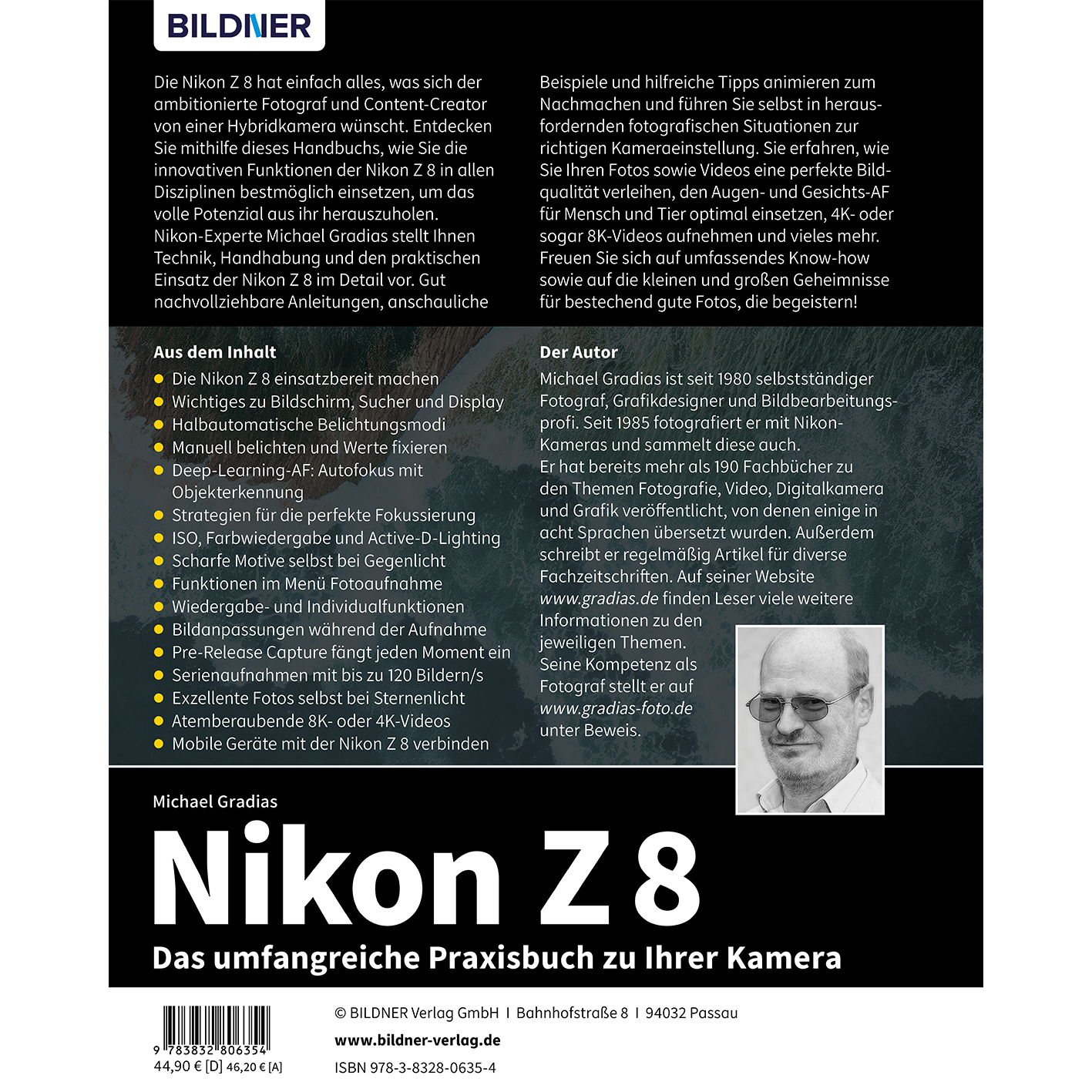 Die Nikon Z 8 hat einfach alles, was sich der ambitionierte Fotograf und Content-Creator von einer Hybridkamera wünscht. Entdecken Sie mithilfe dieses Handbuchs, wie Sie die innovativen Funktionen der Nikon Z 8 in allen Disziplinen bestmöglich einsetzen, um das volle Potenzial aus ihr herauszuholen. Nikon-Experte Michael Gradias stellt Ihnen Technik, Handhabung und den praktischen Einsatz der Nikon Z 8 im Detail vor. Gut nachvollziehbare Anleitungen, anschauliche Beispiele und hilfreiche Tipps animieren zum Nachmachen und führen Sie selbst in herausfordernden fotografischen Situationen zur richtigen Kameraeinstellung. Sie erfahren, wie Sie Ihren Fotos sowie Videos eine perfekte Bildqualität verleihen, den Augen- und Gesichts-AF für Mensch und Tier optimal einsetzen, 4K- oder sogar 8K-Videos aufnehmen und vieles mehr. Freuen Sie sich auf umfassendes Know-how sowie auf die kleinen und großen Geheimnisse für bestechend gute Fotos, die begeistern!