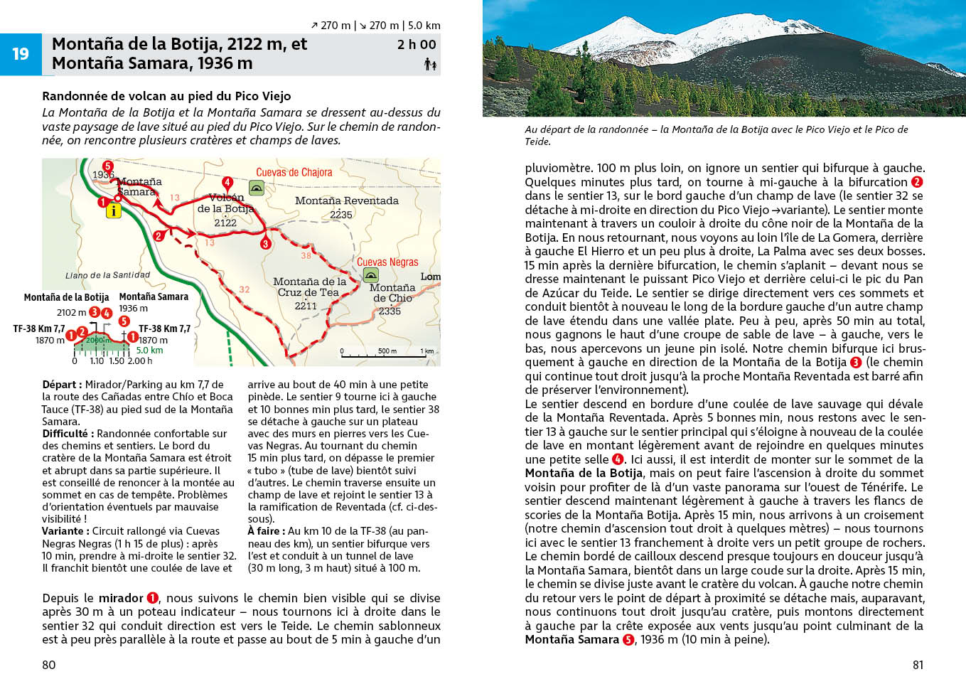 Ainsi, Ténérife n’est non seulement un refuge pour les habitants d’Europe Centrale qui cherchent à fuire l’hiver, mais avant tout une île idéale pour les randonnées. Offrant toujours une vue sur l’étendu de l’océan, l’éventail des 84 randonnées présentées va des sentinelles faciles jusqu’aux falaises abruptes en passant par des promenades paisibles dans les hauteurs ou des montées vers les sommets offrants de belles vues – des parcours de randonnées à travers des forêts sauvages féeriques brumeux ont été pris en compte tout comme les caminos partiellement munis de pavés qui représentaient les liaisons principales entre les villages dans le passé. Beaucoup de parcours proposés dans ce guide de randonnées conviennent donc parfaitement aux randonneurs moins expérimentés. Les alpinistes ne craignant pas les »parcours de force« et supportent un soupçon d’aventure et de frissons trouvent également tout un éventail de choix de parcours : des randonnées téméraires sur des falaises, des parcours spectaculaires dans des gorges et de longues excursions dans les montagnes, dont l’apogée est certainement le sommet de parade du parc national.