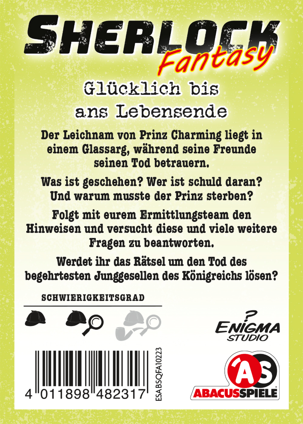 Der Leichnam von Prinz Charming liegt in einem Glassarg, während seine Freunde seinen Tod betrauern. Was ist geschehen? Wer ist schuld daran? Und warum musste der Prinz sterben? Folgt mit eurem Ermittlungsteam den Hinweisen und versucht diese und viele weitere Fragen zu beantworten. Werdet ihr das Rätsel um den Tod des begehrtesten Junggesellen des Königreichs lösen?