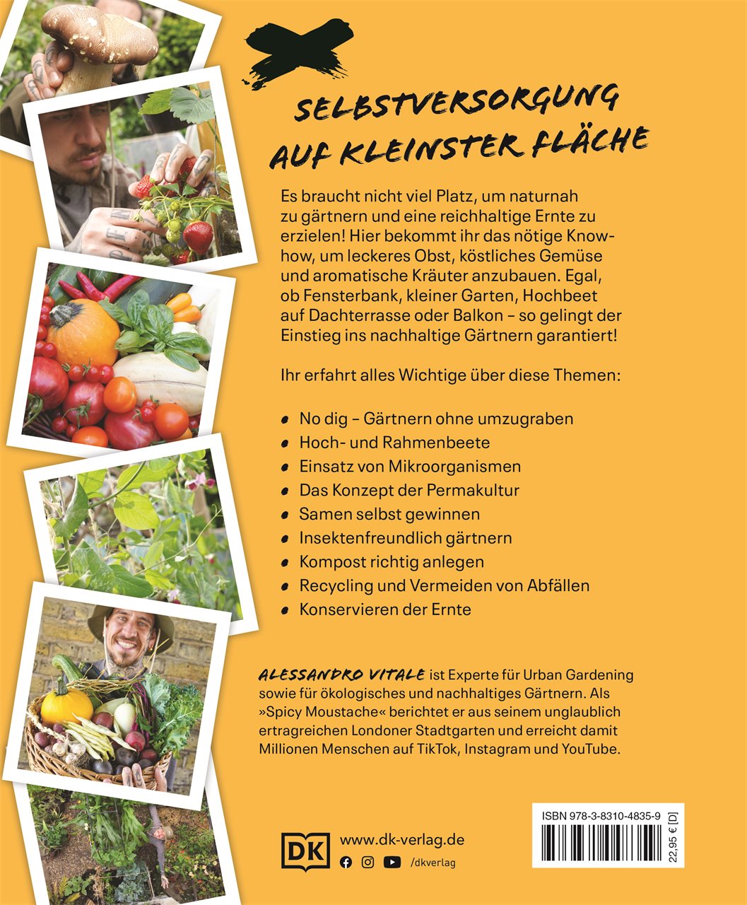 Alessandro Vitale hat in Italien das Gärtnern von seinem Großvater gelernt. Inzwischen wohnt er in London und erzielt dort in seinem kleinen Garten große Ernten. Er ist als Spicy Moustache bekannt und sehr aktiv bei Social Media (Instagram 2,1 Mio. Follower, YouTube 1,2 Mio. Abos und TikTok). Er ist Experte für Urban Gardening sowie für ökologisches und nachhaltiges Gärtnern.