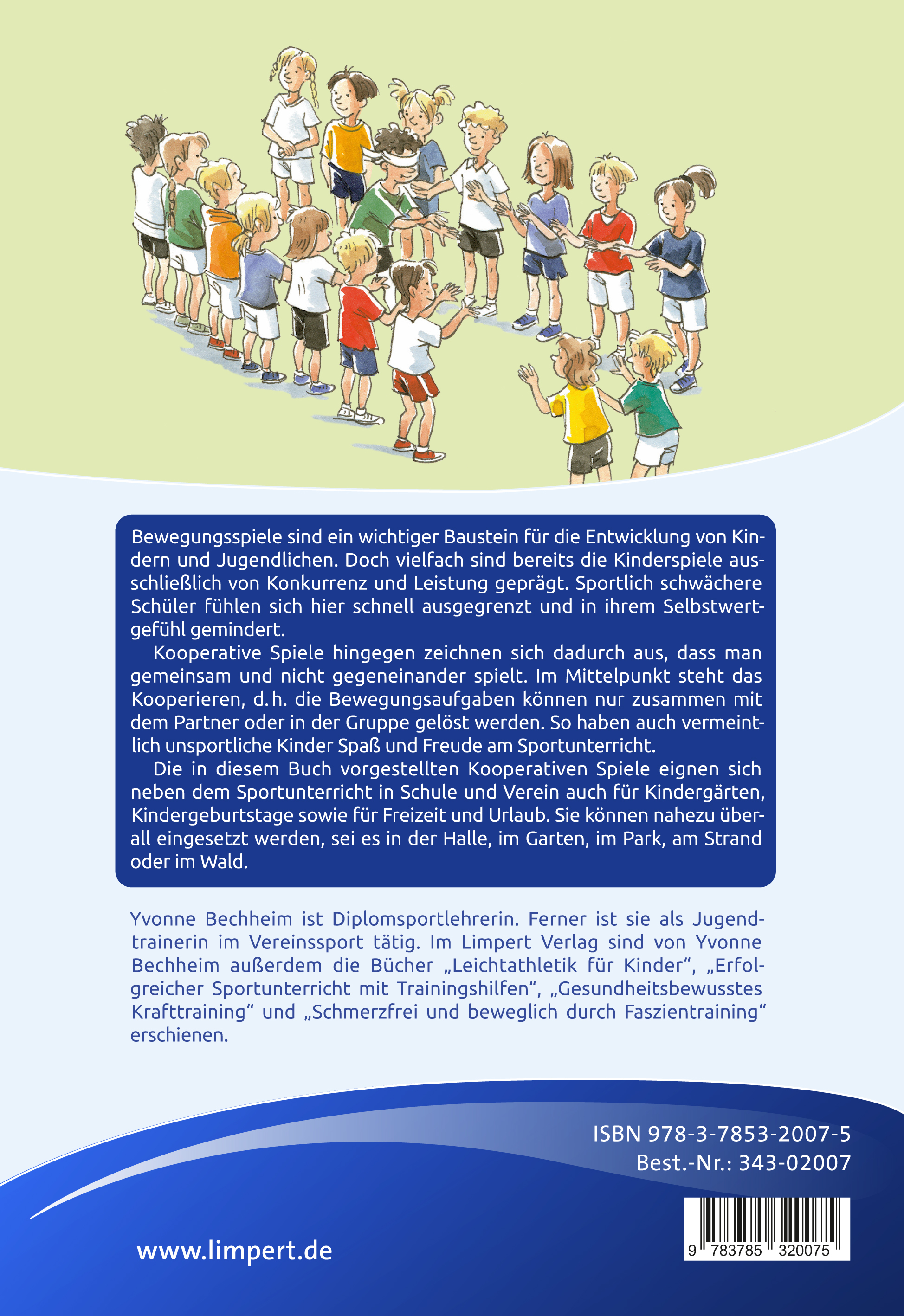 Bewegungsspiele sind ein wichtiger Baustein für die Entwicklung von Kindern und Jugendlichen. Doch vielfach sind bereits die Kinderspiele ausschließlich von Konkurrenz und Leistung geprägt. Sportlich schwächere Schüler fühlen sich hier schnell ausgegrenzt und in ihrem Selbstwertgefühl gemindert. Kooperative Spiele hingegen zeichnen sich dadurch aus, dass man gemeinsam und nicht gegeneinander spielt. Im Mittelpunkt steht das Kooperieren, d.h. die Bewegungsaufgaben können nur zusammen mit dem Partner oder in der Gruppe gelöst werden. So haben auch vermeintlich unsportliche Kinder Spaß und Freude am Sportunterricht. Die in diesem Buch vorgestellten Kooperativen Spiele eignen sich neben dem Sportunterricht in Schule und Verein auch für Kindergärten, Kindergeburtstage sowie für Freizeit und Urlaub. Sie können nahezu überall eingesetzt werden, sei es in der Halle, im Garten, im Park, am Strand oder im Wald.