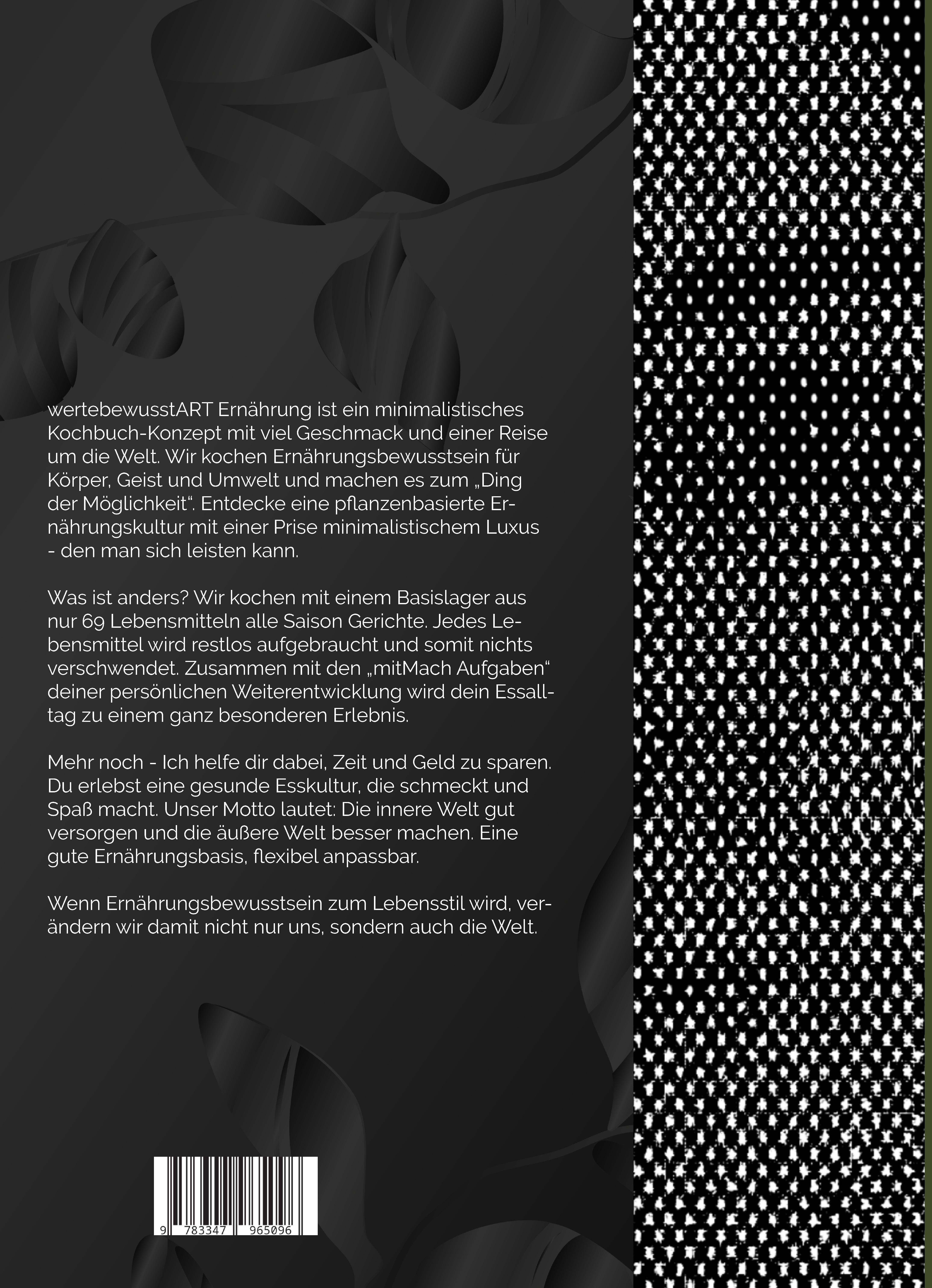 Das wertbewusstART Ernährungskochbuch wurde von Anfang bis Ende von der Ernährungs-Autorin Michaela Weber selbst kreiert. Sie zeigt uns gesunde, pflanzenbasierte Vollwertrezepte für eine genussvolle Selbstfürsorge. Mehr noch, das saisonale Ernährungskochbuch schafft eine Alltagsküche auf eine ganz einfache Art und Weise. Die Gerichte sind keine große Herausforderung - das kann jeder. Sie verbindet Körper, Geist und Umweltgesundheit und schafft damit ein neues Ernährungsbewusstsein. Das Buch ist nach dem Saison Monat Juli geordnet und mit den vorbereiteten Menüplänen schlemmen wir uns durch abwechslungsreiche 5-Tägige-Gesundheitswochen. Darüber hinaus finden wir bei den Einkaufs- und Vorratslisten ausführliche Hinweise, wie bewusster Lebensmittelkonsum funktioniert. Und auch die farbig gekennzeichneten Lebensmittelgruppen geben eine gute Orientierung. Michaela gestaltet für uns eine gesunde und minimalistische Lebensmittel-Vorratshaltung, ein kleines Basislager, das fest verwurzelt ist und trotzdem viel Freiraum für Abwechslung lässt. Ein System gegen Lebensmittelverschwendung! In diesem Ernährungskochbuch wird alles bis zum Ende verbraucht, weil jedes Lebensmittel perfekt auf die Gerichte abgestimmt wurde oder in der Resteküche verarbeitet wird. Wir freuen uns auf eine gesunde Essenswelt. Hier bleibt nichts dem Zufall überlassen, weil das Thema Ernährungsbewusstsein ernst genommen wird.Zusammen mit den "mitMach" Aufgaben und den lesenswerten Geschichten über die verarbeiteten Lebensmittel, schafft die Essensliebhaberin ein ganzheitliches System, das schmeckt und ganz natürlich ist. Wir erleben eine Ernährungswelt mit viel Gesundheit, Begeisterung und Mut. Das Ziel ist, dein Inneres gut zu versorgen und die äußere Welt besser zu machen.