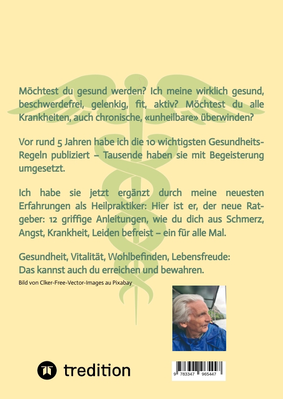 Ich führe seit nunmehr 35 Jahren eine Gesundheitspraxis in Fribourg, Schweiz. Neben zahlreichen kurzen und prägnanten Ratgebern zu Ernährung, Liebe, Humor, Psyche hatte ich vor 5 Jahren den Ratgeber "Top 10 Gesundheit" publiziert. Er wurde zu einem Erfolg. Nun habe ich ihn aktualisiert und ergänzt - er umfasst jetzt 160 Seiten geballtes Gesundheits-Wissen. So gelingt es auch dir, dich aus Schmerz, chronischen Leiden, unheilbaren oder ererbten Krankheiten zu befreien! Hier findest du alle Voraussetzungen dazu.