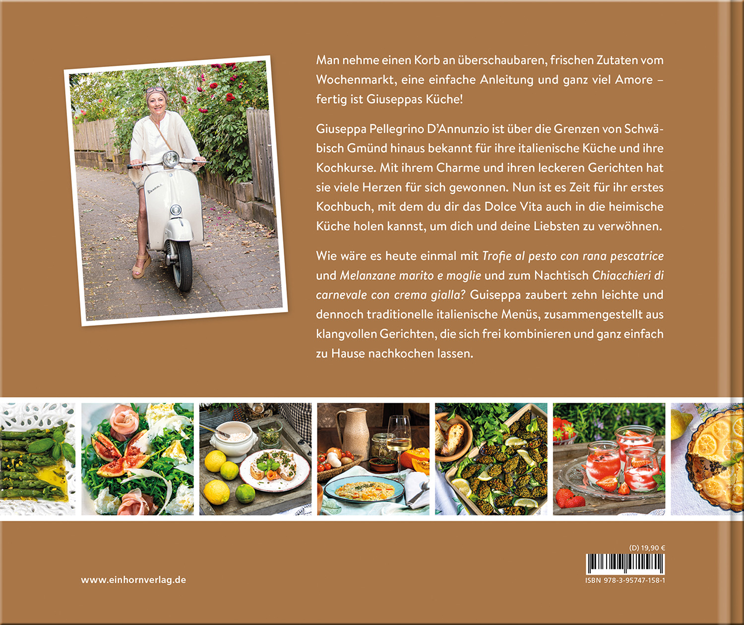 Giuseppa Pellegrino D’Annunzio ist über die Grenzen von Schwäbisch Gmünd hinaus bekannt für ihre italienische Küche und ihre Kochkurse. Mit ihrem Charme und ihren leckeren Gerichten hat sie viele Herzen für sich gewonnen. Nun ist es Zeit für ihr erstes Kochbuch, mit dem du dir das Dolce Vita auch in die heimische Küche holen kannst, um dich und deine Liebsten zu verwöhnen.