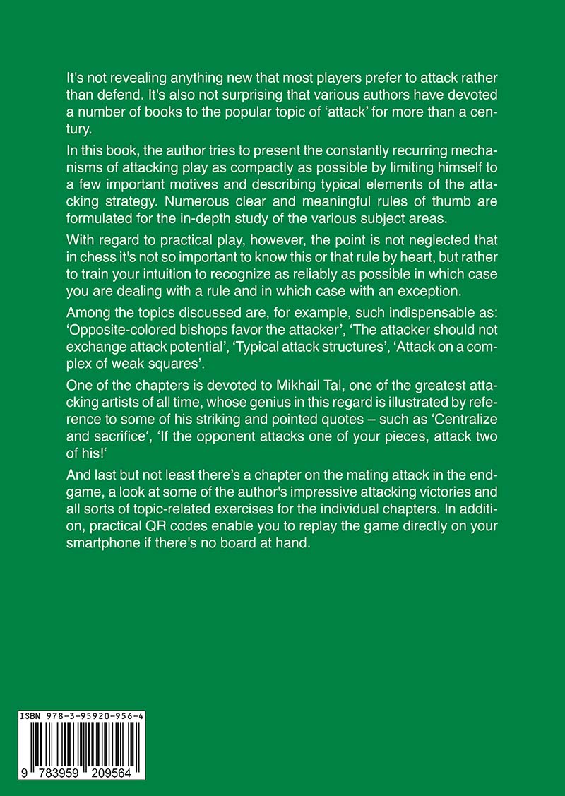 It's not revealing anything new that most players prefer to attack rather than defend. It's also not surprising that various authors have devoted a number of books to the popular topic of 'attack' for more than a century.In this book, the author tries to present the constantly recurring mechanisms of attacking play as compactly as possible by limiting himself to a few important motives and describing typical elements of the attacking strategy. Numerous clear and meaningful rules of thumb are formulated for the in-depth study of the various subject areas.With regard to practical play, however, the point is not neglected that in chess it's not so important to know this or that rule by heart, but rather to train your intuition to recognize as reliably as possible in which case you are dealing with a rule and in which case with an exception.Among the topics discussed are, for example, such indispensable as: 'Opposite-colored bishops favor the attacker', 'The attacker should not exchange attack potential', 'Typical attack structures', 'Attack on a complex of weak squares'.One of the chapters is devoted to Mikhail Tal, one of the greatest attacking artists of all time, whose genius in this regard is illustrated by reference to some of his striking and pointed quotes - such as 'Centralize and sacrifice', 'If the opponent attacks one of your pieces, attack two of his!'And last but not least there's a chapter on the mating attack in the endgame, a look at some of the author's impressive attacking victories and all sorts of topic-related exercises for the individual chapters. In addition, practical QR codes enable you to replay the game directly on your smartphone if there's no board at hand.