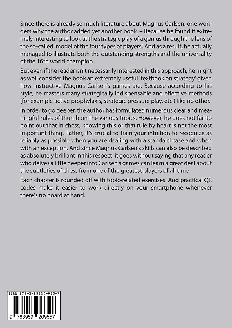 Since there is already so much literature about Magnus Carlsen, one wonders why the author added yet another book. - Because he found it extremely interesting to look at the strategic play of a genius through the lens of the so-called 'model of the four types of players'. And as a result, he actually managed to illustrate both the outstanding strengths and the universality of the 16th world champion.But even if the reader isn't necessarily interested in this approach, he might as well consider the book an extremely useful 'textbook on strategy' given how instructive Magnus Carlsen's games are. Because according to his style, he masters many strategically indispensable and effective methods (for example active prophylaxis, strategic pressure play, etc.) like no other.In order to go deeper, the author has formulated numerous clear and meaningful rules of thumb on the various topics. However, he does not fail to point out that in chess, knowing this or that rule by heart is not the most important thing. Rather, it's crucial to train your intuition to recognize as reliably as possible when you are dealing with a standard case and when with an exception. And since Magnus Carlsen's skills can also be described as absolutely brilliant in this respect, it goes without saying that any reader who delves a little deeper into Carlsen's games can learn a great deal about the subtleties of chess from one of the greatest players of all timeEach chapter is rounded off with topic-related exercises. And practical QR codes make it easier to work directly on your smartphone whenever there's no board at hand.