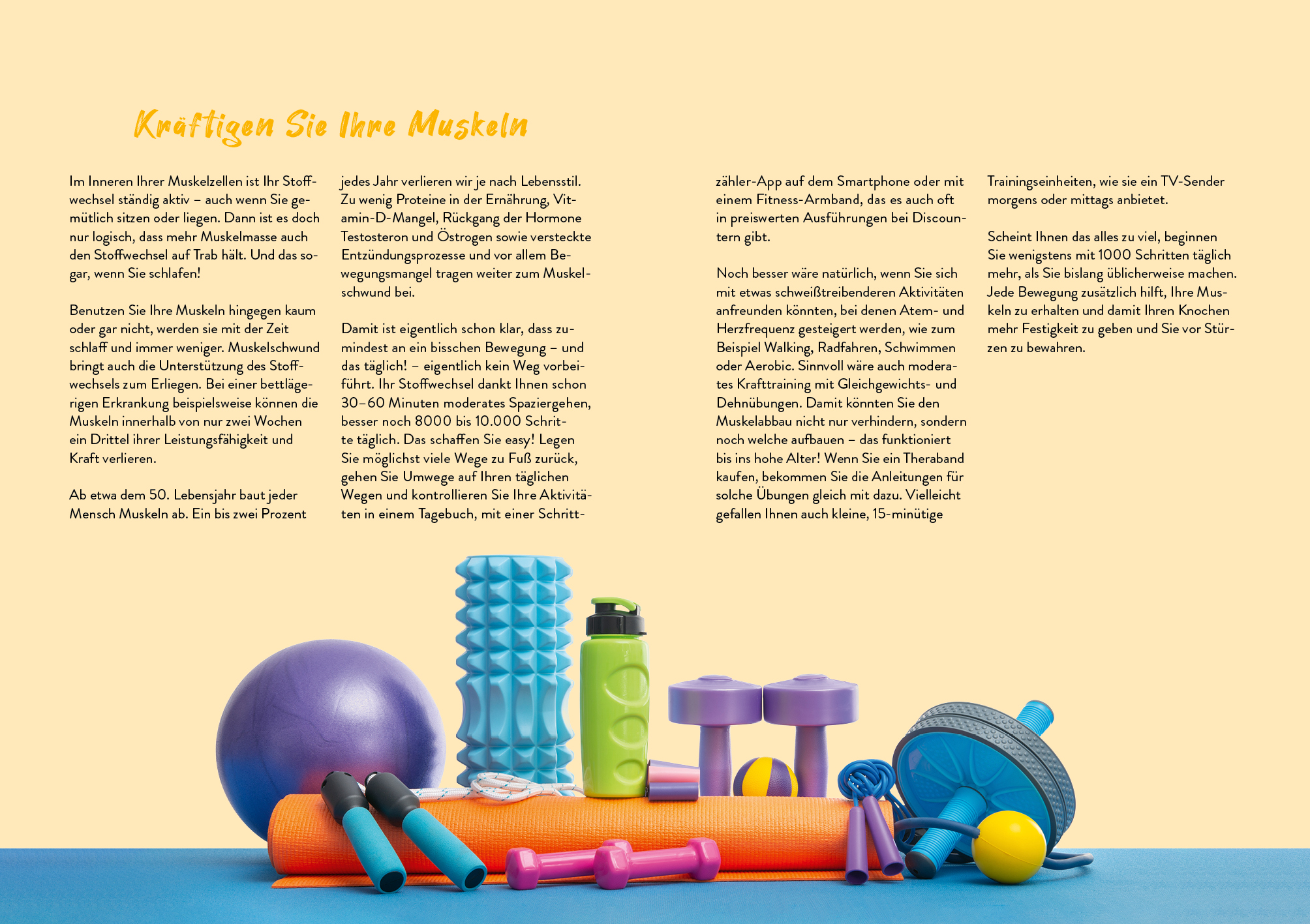 Schon ab dem 50. Lebensjahr verändert sich der Körper. Er baut Muskeln ab, der Stoffwechsel verlangsamt sich, eine unaufmerksame Lebensführung steckt man nicht mehr so leicht weg. Spätestens ab 60 wäre es gut, etwas zu unternehmen, um gesund und fit zu altern. Der Körper braucht zum Beispiel mehr Eiweiß, um Muskeln zu erhalten. Vitamine und Mineralien werden verlangsamt aufgenommen, das Durstgefühl lässt nach und sportliche Aktivitäten sind bisweilen nur eingeschränkt möglich.In diesem Buch erfährt man, was der Köper beim Altern besonders braucht und wie man an genügend Vitamine und Mineralstoffe kommt, ohne unnötige Kalorien zu sich zu nehmen. Auf Wissensseiten gibt es kompakte Informationen zum Beispiel zu Altersdiabetes, Knochendichte, Östrogenmangel und anderen typischen Veränderungen im Alter und dazu, wie man diesen mit guter und ausgewogener Ernährung vorbeugen kann. Die über 100 bebilderten Rezepte enthalten all die Lebensmittel, die besonders wichtig sind. Zudem können alle Gerichte mit Schritt-für-Schritt-Anleitungen auch von Ungeübten gekocht werden und es können alternativ auch Tiefkühlware und Konserven verarbeitet werden, was den Arbeitsaufwand erleichtert. Der beste Weg, um lange gesund und fit zu bleiben!