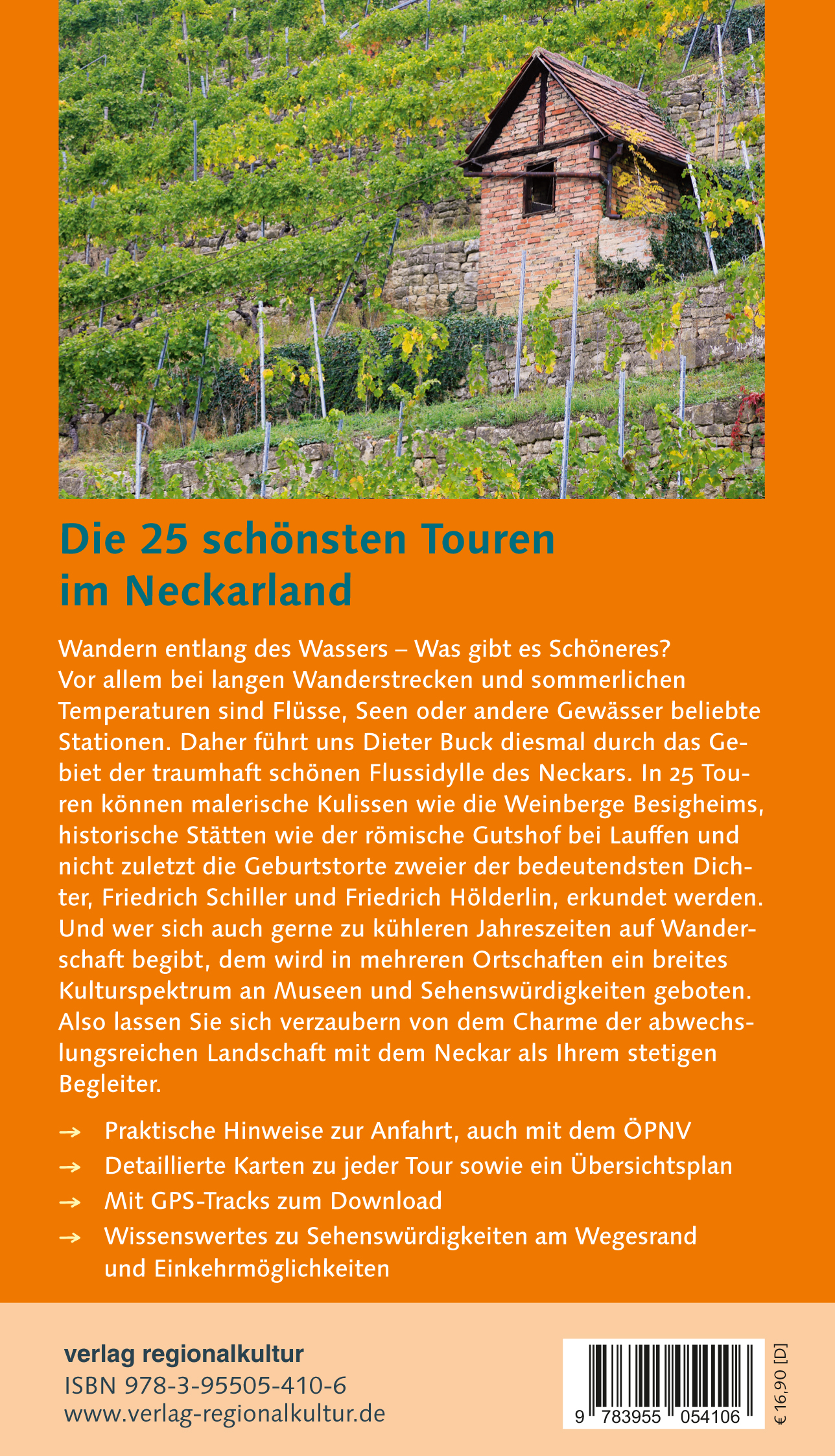 Wandern entlang des Wassers - was gibt es Schöneres? Vor allem bei langen Wanderstrecken und sommerlichen Temperaturen sind Flüsse, Seen oder andere Gewässer beliebte Stationen. Daher führt uns Dieter Buck diesmal durch das Gebiet der traumhaft schönen Flussidylle des Neckars. In 25 Touren können malerische Kulissen wie die Weinberge Besigheims, historische Stätten wie der römische Gutshof bei Lauffen und nicht zuletzt die Geburtsorte zweier der bedeutendsten Dichter, Friedrich Schiller und Friedrich Hölderlin, erkundet werden. Und wer sich auch gerne zu kühleren Jahreszeiten auf Wanderschaft begibt, dem wird in mehreren Ortschaften ein breites Kulturspektrum an Museen und Sehenswürdigkeiten geboten. Also lassen Sie sich verzaubern von dem Charme der abwechslungsreichen Landschaft mit dem Neckar als Ihrem stetigen Begleiter. Praktische Hinweise zur Anfahrt, auch mit dem ÖPNV Detaillierte Karten zu jeder Tour sowie ein Übersichtsplan Mit GPS-Tracks zum Download Wissenswertes zu Sehenswürdigkeiten am Wegesrand und Einkehrmöglichkeiten