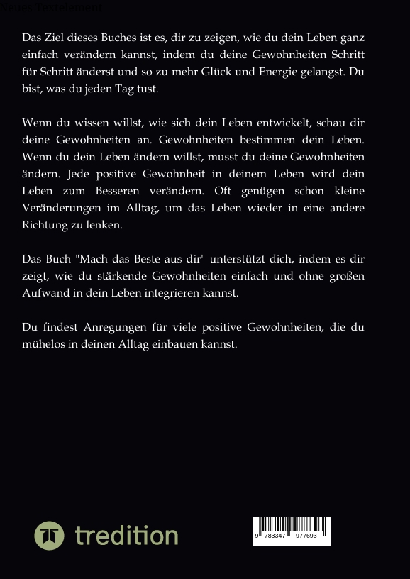 Das Ziel dieses Buches ist es, dir zu zeigen, wie du dein Leben ganz einfach verändern kannst, indem du deine Gewohnheiten Schritt für Schritt änderst und so zu mehr Glück und Energie gelangst. Du bist, was du jeden Tag tust. Wenn du wissen willst, wie sich dein Leben entwickelt, schau dir deine Gewohnheiten an. Gewohnheiten bestimmen dein Leben. Wenn du dein Leben ändern willst, musst du deine Gewohnheiten ändern. Jede positive Gewohnheit in deinem Leben wird dein Leben zum Besseren verändern.Oft genügen schon kleine Veränderungen im Alltag, um das Leben wieder in eine andere Richtung zu lenken.Das Buch "Mach das Beste aus dir" unterstützt dich, indem es dir zeigt, wie du stärkende Gewohnheiten einfach und ohne großen Aufwand in dein Leben integrieren kannst. Du findest Anregungen für viele positive Gewohnheiten, die du mühelos in deinen Alltag einbauen kannst.