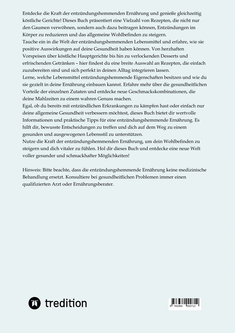 Entdecke die Kraft der entzündungshemmenden Ernährung und genieße gleichzeitig köstliche Gerichte!Dieses Buch präsentiert eine Vielzahl von Rezepten, die nicht nur den Gaumen verwöhnen, sondern auch dazu beitragen können, Entzündungen im Körper zu reduzieren und das allgemeine Wohlbefinden zu steigern. Tauche ein in die Welt der entzündungshemmenden Lebensmittel und erfahre, wie sie positive Auswirkungen auf deine Gesundheit haben können.Von herzhaften Vorspeisen über köstliche Hauptgerichte bis hin zu verlockenden Desserts und erfrischenden Getränken - hier findest du eine breite Auswahl an Rezepten, die einfach zuzubereiten sind und sich perfekt in deinen Alltag integrieren lassen.Lerne, welche Lebensmittel entzündungshemmende Eigenschaften besitzen und wie du sie gezielt in deine Ernährung einbauen kannst. Erfahre mehr über die gesundheitlichen Vorteile der einzelnen Zutaten und entdecke neue Geschmackskombinationen, die deine Mahlzeiten zu einem wahren Genuss machen. Egal, ob du bereits mit entzündlichen Erkrankungen zu kämpfen hast oder einfach nur deine allgemeine Gesundheit verbessern möchtest, dieses Buch bietet dir wertvolle Informationen und praktische Tipps für eine entzündungshemmende Ernährung. Es hilft dir, bewusste Entscheidungen zu treffen und dich auf dem Weg zu einem gesunden und ausgewogenen Lebensstil zu unterstützen.Nutze die Kraft der entzündungshemmenden Ernährung, um dein Wohlbefinden zu steigern und dich vitaler zu fühlen.