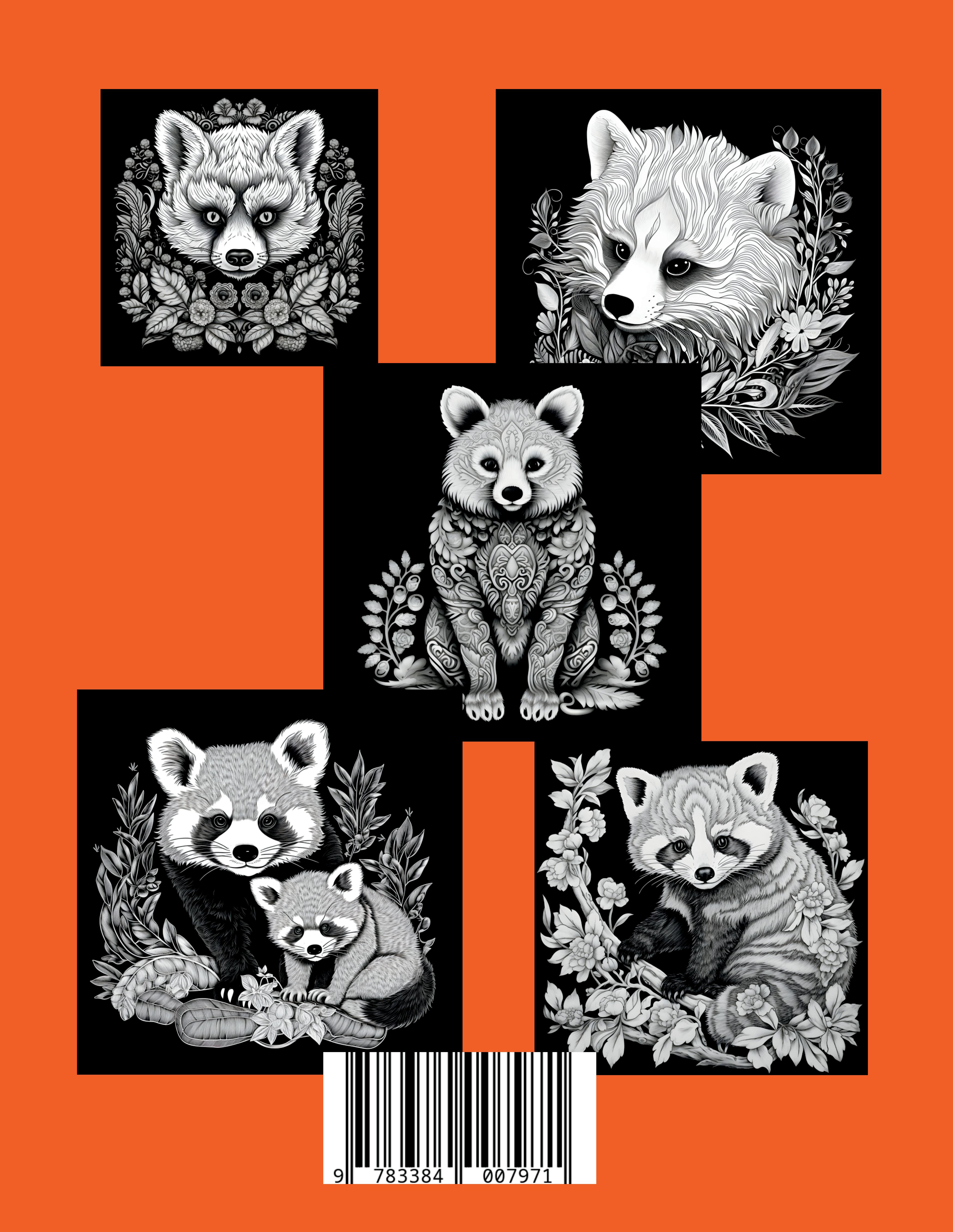 Roter Panda Malbuch mit wunderschönen Motiven auf schwarzem Hintergrund. Malbuch Roter Panda. Pandamalbuch.