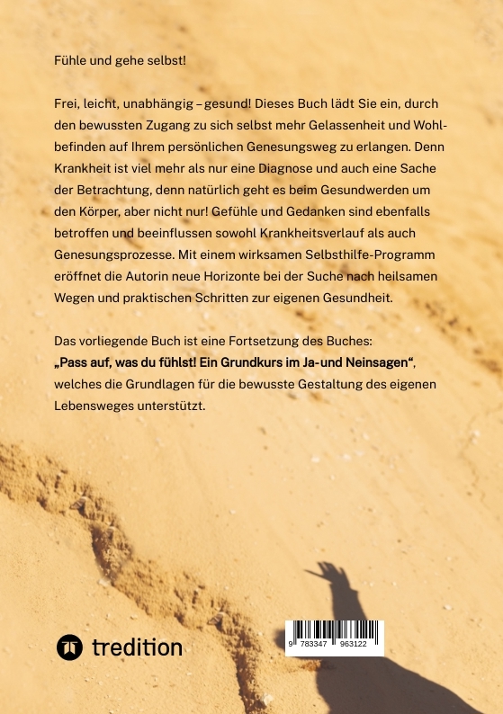 Das Buch „Fühle und gehe selbst!“ dient der Befähigung, die Verantwortung nicht nur für die Gesundheit, sondern auch für die Gestaltung des Lebensweges in die eigenen Hände zu nehmen. Es zeigt Lösungswege und Strategien auf, unterstützt darin, eigenverantwortlich zu agieren und Vertrauen in die eigene Heilungskompetenz zu erlangen.