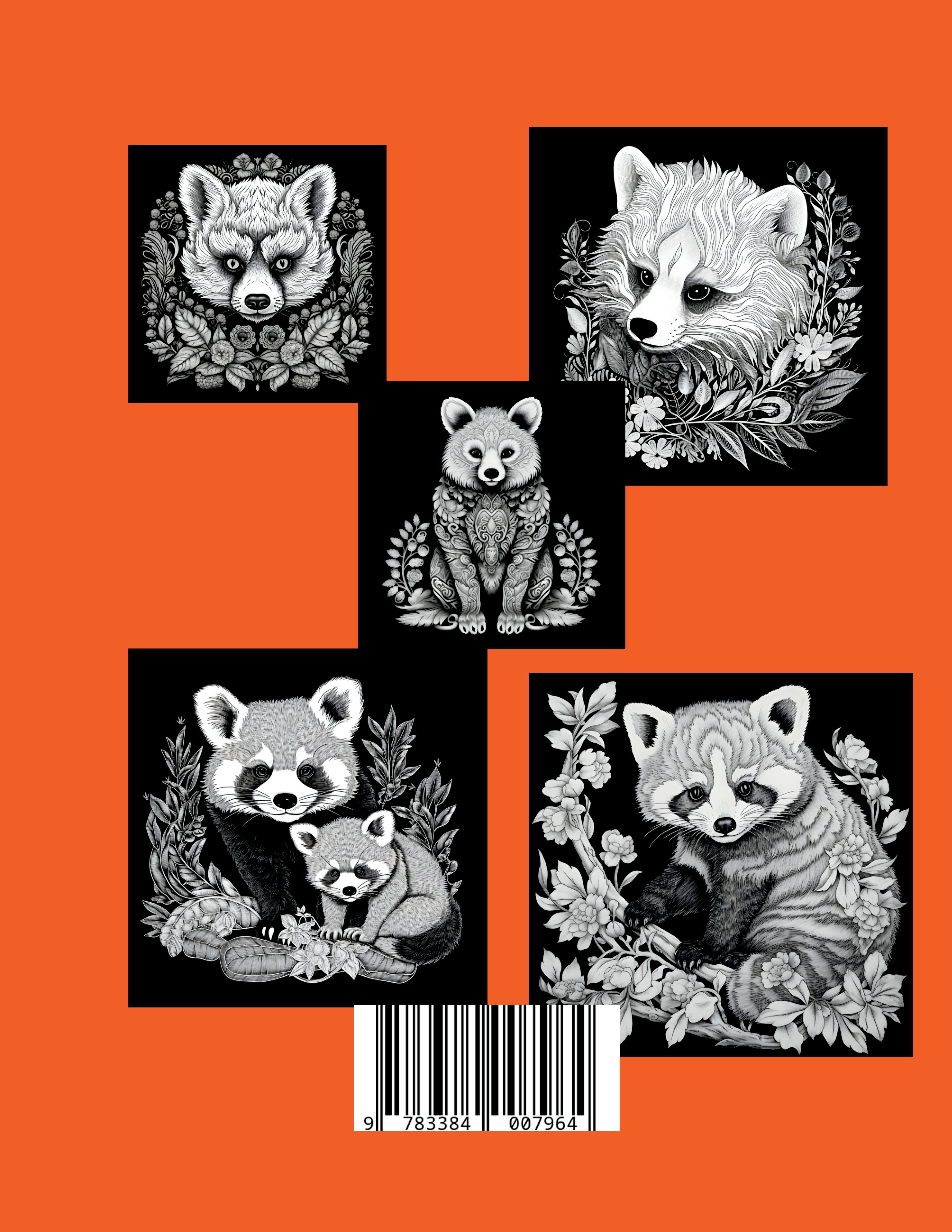 Roter Panda Malbuch mit wunderschönen Motiven auf schwarzem Hintergrund. Malbuch Roter Panda. Pandamalbuch.