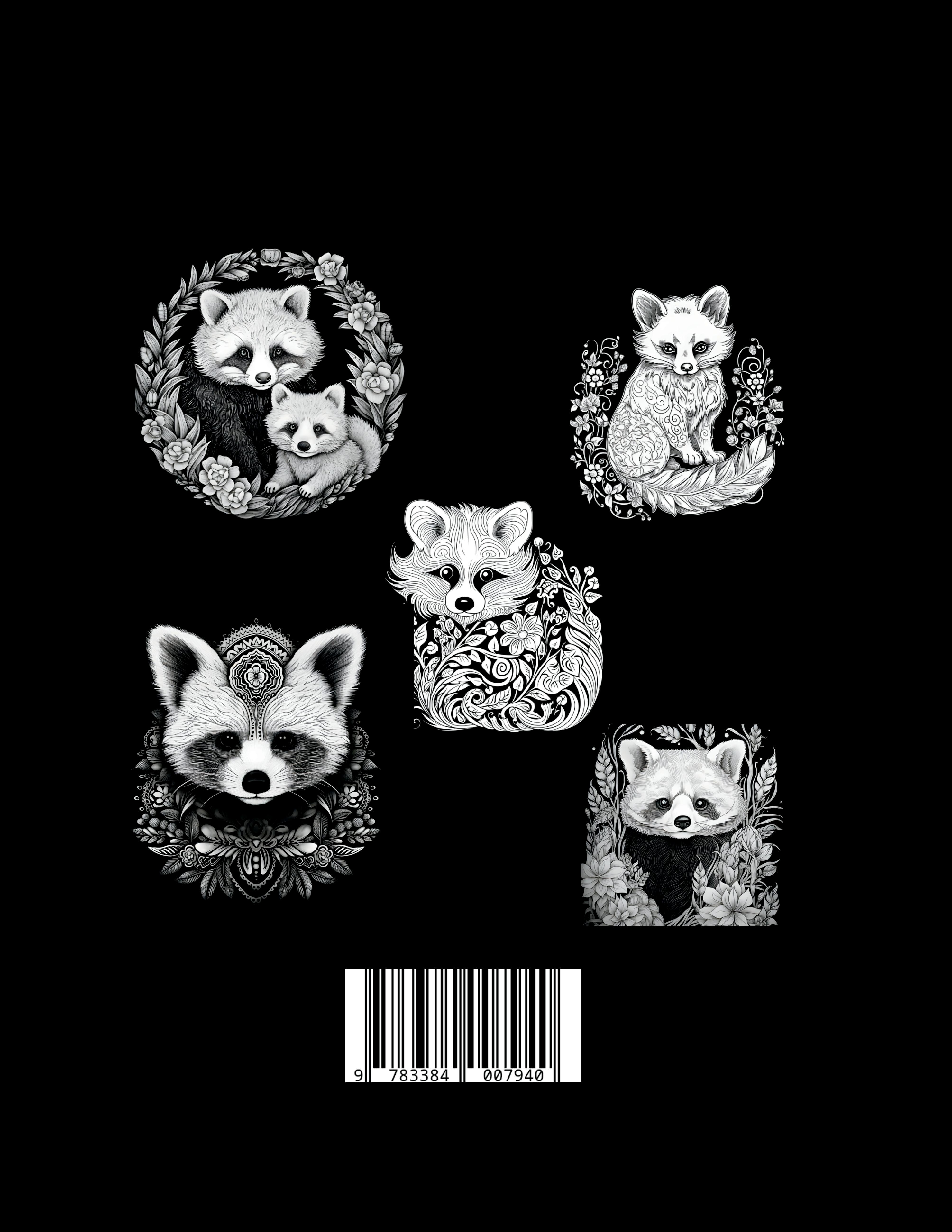 Supersüße Motive mit dem Roten Panda auf schwarzem Hintergrund. Schwarzes Malbuch. Pandamalbuch. Red Panda. Malbuch Roter Panda.