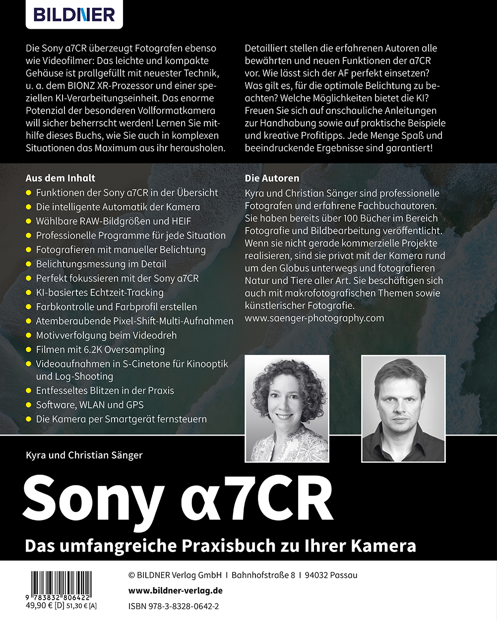 Die Sony Alpha 7C R überzeugt Fotografen ebenso wie Videofilmer: Das leichte und kompakte Gehäuse ist prallgefüllt mit neuester Technik, u. a. dem BIONZ XR-Prozessor und einer speziellen KI-Verarbeitungseinheit. Das enorme Potenzial der besonderen Vollformatkamera will sicher beherrscht werden! Lernen Sie mithilfe dieses Buchs, wie Sie auch in komplexen Situationen das Maximum aus ihr herausholen. Detailliert stellen die erfahrenen Autoren alle bewährten und neuen Funktionen der Sony 7C R vor. Wie lässt sich der AF perfekt einsetzen? Was gilt es, für die optimale Belichtung zu beachten? Welche Möglichkeiten bietet die KI? Freuen Sie sich auf anschauliche Anleitungen zur Handhabung sowie auf praktische Beispiele und kreative Profitipps. Jede Menge Spaß und beeindruckende Ergebnisse sind garantiert!