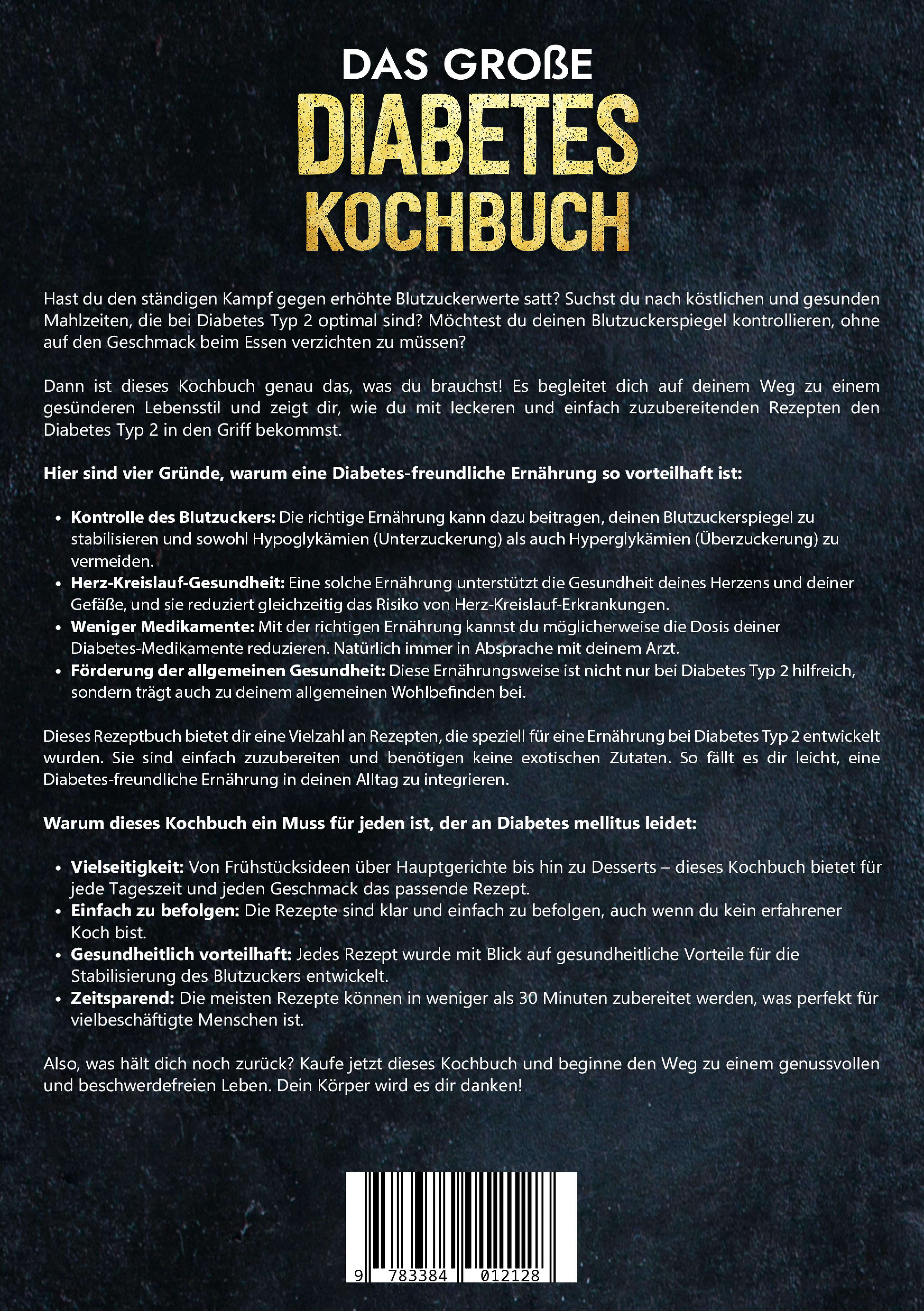 Hast du den ständigen Kampf gegen erhöhte Blutzuckerwerte satt? Suchst du nach köstlichen und gesunden Mahlzeiten, die bei Diabetes Typ 2 optimal sind? Möchtest du deinen Blutzuckerspiegel kontrollieren, ohne auf den Geschmack beim Essen verzichten zu müssen?Dann ist dieses Kochbuch genau das, was du brauchst! Es begleitet dich auf deinem Weg zu einem gesünderen Lebensstil und zeigt dir, wie du mit leckeren und einfach zuzubereitenden Rezepten den Diabetes Typ 2 in den Griff bekommst.Hier sind vier Gründe, warum eine Diabetes-freundliche Ernährung so vorteilhaft ist:- Kontrolle des Blutzuckers: Die richtige Ernährung kann dazu beitragen, deinen Blutzuckerspiegel zu stabilisieren und sowohl Hypoglykämien (Unterzuckerung) als auch Hyperglykämien (Überzuckerung) zu vermeiden.- Herz-Kreislauf-Gesundheit: Eine solche Ernährung unterstützt die Gesundheit deines Herzens und deiner Gefäße, und sie reduziert gleichzeitig das Risiko von Herz-Kreislauf-Erkrankungen.- Weniger Medikamente: Mit der richtigen Ernährung kannst du möglicherweise die Dosis deiner Diabetes-Medikamente reduzieren. Natürlich immer in Absprache mit deinem Arzt.- Förderung der allgemeinen Gesundheit: Diese Ernährungsweise ist nicht nur bei Diabetes Typ 2 hilfreich, sondern trägt auch zu deinem allgemeinen Wohlbefinden bei.Dieses Rezeptbuch bietet dir eine Vielzahl an Rezepten, die speziell für eine Ernährung bei Diabetes Typ 2 entwickelt wurden. Sie sind einfach zuzubereiten und benötigen keine exotischen Zutaten. So fällt es dir leicht, eine Diabetes-freundliche Ernährung in deinen Alltag zu integrieren.Warum dieses Kochbuch ein Muss für jeden ist, der an Diabetes mellitus leidet:- Vielseitigkeit: Von Frühstücksideen über Hauptgerichte bis hin zu Desserts - dieses Kochbuch bietet für jede Tageszeit und jeden Geschmack das passende Rezept.- Einfach zu befolgen: Die Rezepte sind klar und einfach zu befolgen, auch wenn du kein erfahrener Koch bist.- Gesundheitlich vorteilhaft: Jedes Rezept wurde mit Blick auf gesundheitliche Vorteile für die Stabilisierung des Blutzuckers entwickelt.- Zeitsparend: Die meisten Rezepte können in weniger als 30 Minuten zubereitet werden, was perfekt für vielbeschäftigte Menschen ist.Also, was hält dich noch zurück? Kaufe jetzt dieses Kochbuch und beginne den Weg zu einem genussvollen und beschwerdefreien Leben. Dein Körper wird es dir danken!