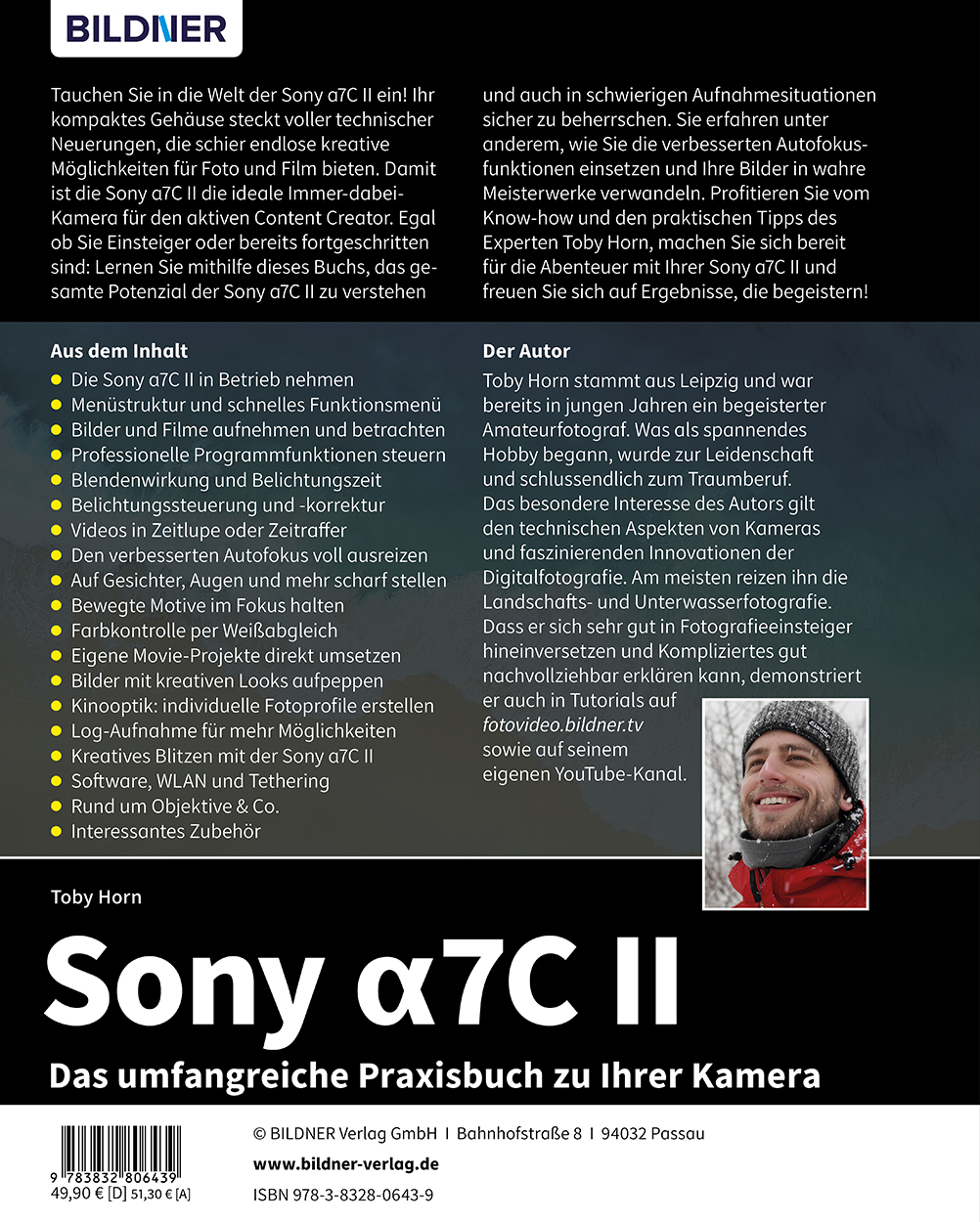 Tauchen Sie in die Welt der Sony Alpha 7C II ein! Ihr kompaktes Gehäuse steckt voller technischer Neuerungen, die schier endlose kreative Möglichkeiten für Foto und Film bieten. Damit ist die Sony 7C II die ideale Immer-Dabei-Kamera für den aktiven Content Creator. Egal ob Sie Einsteiger oder bereits fortgeschritten sind: Lernen Sie mithilfe dieses Buchs, das gesamte Potenzial der Sony a7C II zu verstehen und auch in schwierigen Aufnahmesituationen sicher zu beherrschen. Sie erfahren u. a., wie Sie Ihre Videos mit Creative Look individuell gestalten und mit S-Cinetone in cineastische Meisterwerke verwandeln. Profitieren Sie vom Know-how und den praktischen Tipps des Experten Toby Horn, machen Sie sich bereit für die Abenteuer mit Ihrer Sony a7C II und freuen Sie sich auf Ergebnisse, die begeistern!