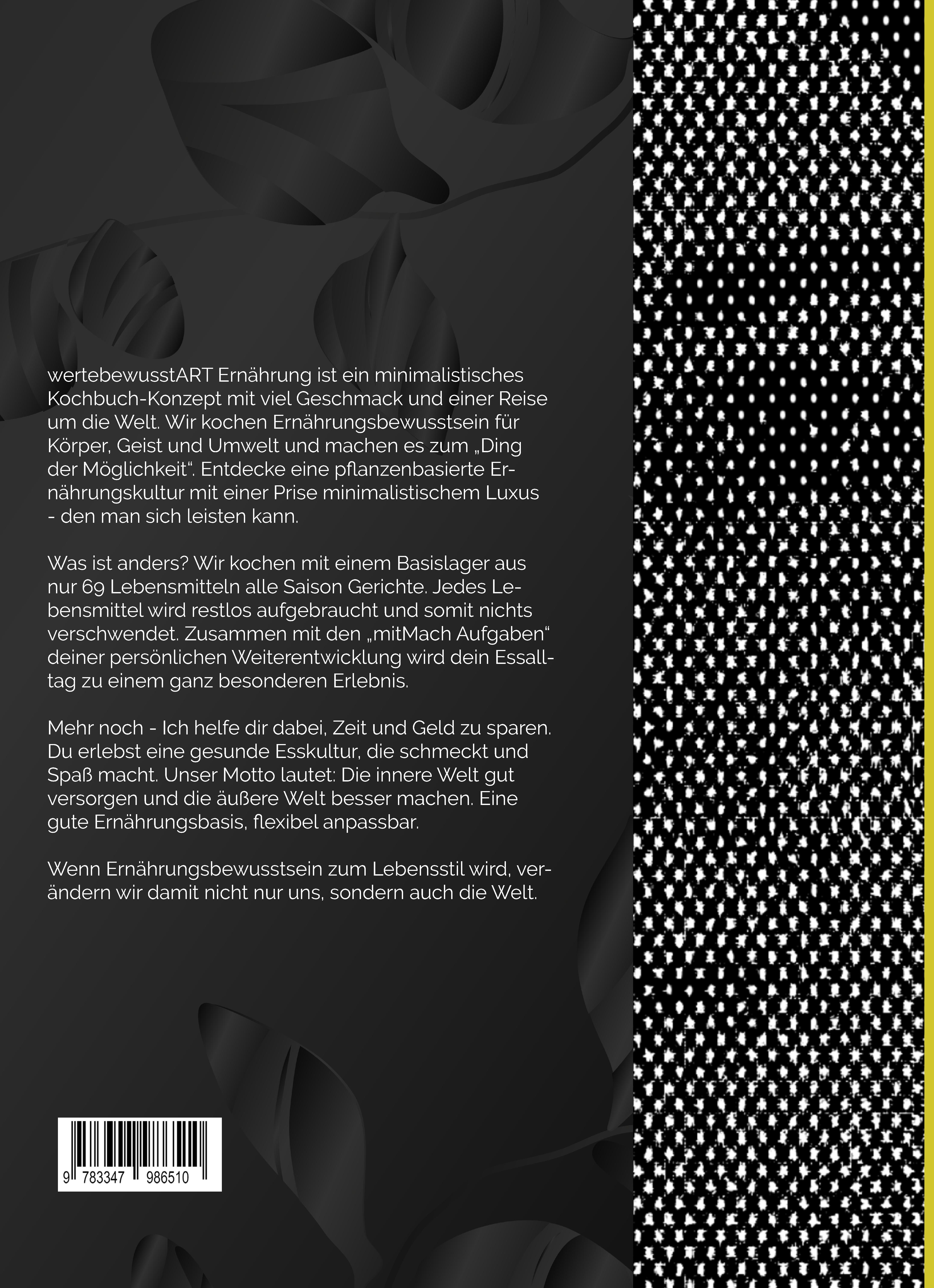 Das wertbewusstART Ernährungskochbuch wurde von Anfang bis Ende von der Ernährungs-Autorin Michaela Weber selbst kreiert. Sie zeigt uns gesunde, pflanzenbasierte Vollwertrezepte für eine genussvolle Selbstfürsorge. Mehr noch, das saisonale Ernährungskochbuch schafft eine Alltagsküche auf eine ganz einfache Art und Weise. Die Gerichte sind keine große Herausforderung - das kann jeder. Sie verbindet Körper, Geist und Umweltgesundheit und schafft damit ein neues Ernährungsbewusstsein. Das Buch ist nach dem Saison Monat August geordnet und mit den vorbereiteten Menüplänen schlemmen wir uns durch abwechslungsreiche 5-Tägige-Gesundheitswochen. Darüber hinaus finden wir bei den Einkaufs- und Vorratslisten ausführliche Hinweise, wie bewusster Lebensmittelkonsum funktioniert. Und auch die farbig gekennzeichneten Lebensmittelgruppen geben eine gute Orientierung. Michaela gestaltet für uns eine gesunde und minimalistische Lebensmittel-Vorratshaltung, ein kleines Basislager, das fest verwurzelt ist und trotzdem viel Freiraum für Abwechslung lässt. Ein System gegen Lebensmittelverschwendung! In diesem Ernährungskochbuch wird alles bis zum Ende verbraucht, weil jedes Lebensmittel perfekt auf die Gerichte abgestimmt wurde oder in der Resteküche verarbeitet wird. Wir freuen uns auf eine gesunde Essenswelt. Hier bleibt nichts dem Zufall überlassen, weil das Thema Ernährungsbewusstsein ernst genommen wird.Zusammen mit den "mitMach" Aufgaben und den lesenswerten Geschichten über die verarbeiteten Lebensmittel, schafft die Essensliebhaberin ein ganzheitliches System, das schmeckt und ganz natürlich ist. Wir erleben eine Ernährungswelt mit viel Gesundheit, Begeisterung und Mut. Das Ziel ist, dein Inneres gut zu versorgen und die äußere Welt besser zu machen.