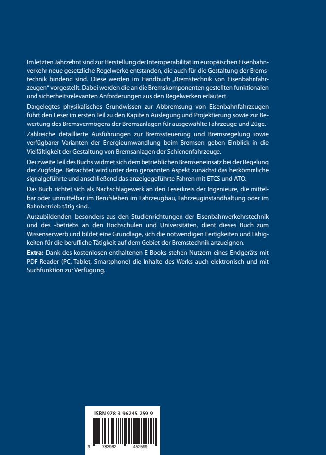 Auszubildenden, besonders aus den Studienrichtungen der Eisenbahnverkehrstechnik und des -betriebs an den Hochschulen und Universitäten, dient dieses Buch zum Wissenserwerb und bildet eine Grundlage, sich die notwendigen Fertigkeiten und Fähigkeiten für die berufliche Tätigkeit auf dem Gebiet der Bremstechnik anzueignen.