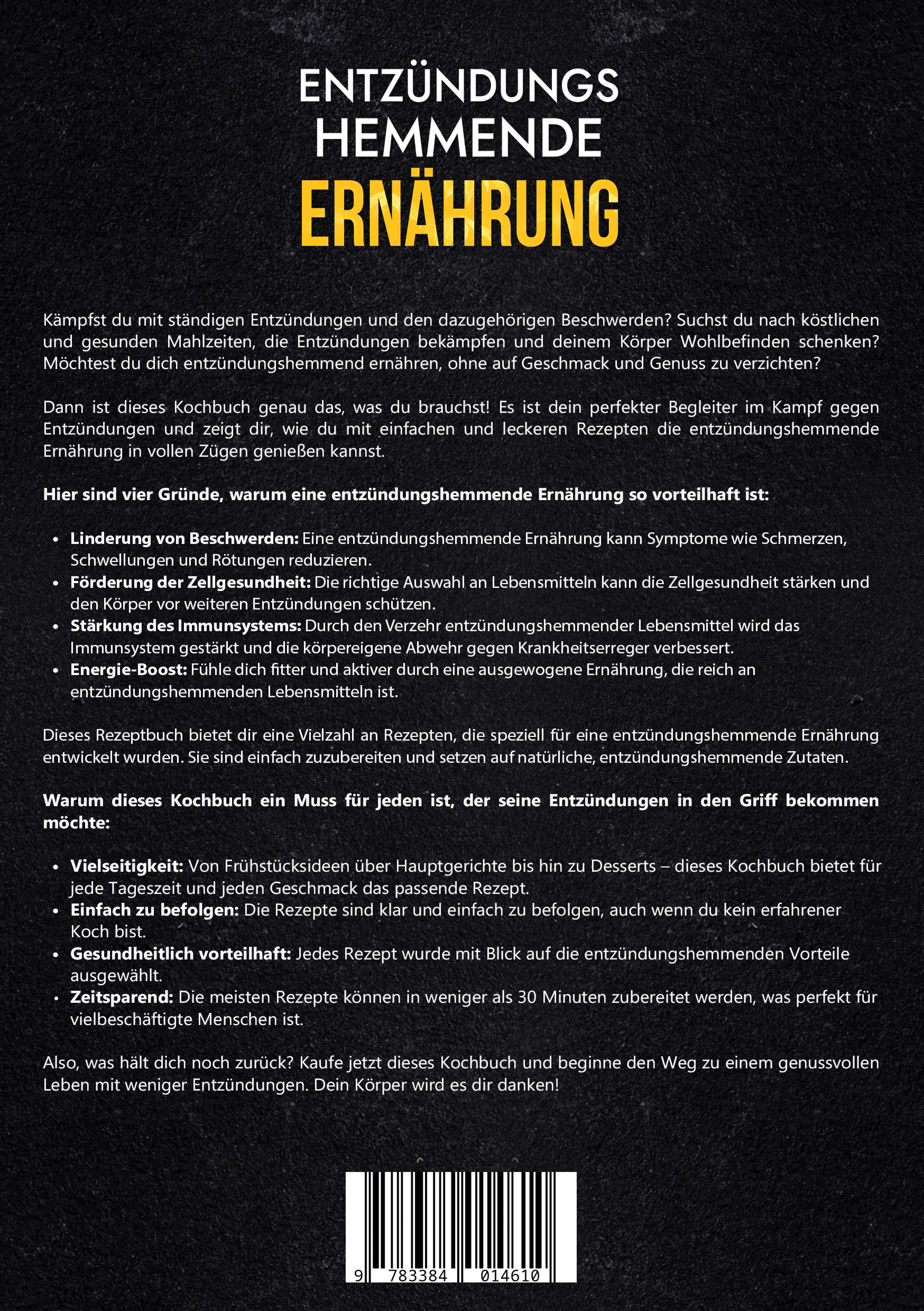 Kämpfst du mit ständigen Entzündungen und den dazugehörigen Beschwerden? Suchst du nach köstlichen und gesunden Mahlzeiten, die Entzündungen bekämpfen und deinem Körper Wohlbefinden schenken? Möchtest du dich entzündungshemmend ernähren, ohne auf Geschmack und Genuss zu verzichten?Dann ist dieses Kochbuch genau das, was du brauchst! Es ist dein perfekter Begleiter im Kampf gegen Entzündungen und zeigt dir, wie du mit einfachen und leckeren Rezepten die entzündungshemmende Ernährung in vollen Zügen genießen kannst.Hier sind vier Gründe, warum eine entzündungshemmende Ernährung so vorteilhaft ist:- Linderung von Beschwerden: Eine entzündungshemmende Ernährung kann Symptome wie Schmerzen, Schwellungen und Rötungen reduzieren.- Förderung der Zellgesundheit: Die richtige Auswahl an Lebensmitteln kann die Zellgesundheit stärken und den Körper vor weiteren Entzündungen schützen.- Stärkung des Immunsystems: Durch den Verzehr entzündungshemmender Lebensmittel wird das Immunsystem gestärkt und die körpereigene Abwehr gegen Krankheitserreger verbessert.- Energie-Boost: Fühle dich fitter und aktiver durch eine ausgewogene Ernährung, die reich an entzündungshemmenden Lebensmitteln ist.Dieses Rezeptbuch bietet dir eine Vielzahl an Rezepten, die speziell für eine entzündungshemmende Ernährung entwickelt wurden. Sie sind einfach zuzubereiten und setzen auf natürliche, entzündungshemmende Zutaten.Warum dieses Kochbuch ein Muss für jeden ist, der seine Entzündungen in den Griff bekommen möchte:- Vielseitigkeit: Von Frühstücksideen über Hauptgerichte bis hin zu Desserts - dieses Kochbuch bietet für jede Tageszeit und jeden Geschmack das passende Rezept.- Einfach zu befolgen: Die Rezepte sind klar und einfach zu befolgen, auch wenn du kein erfahrener Koch bist.- Gesundheitlich vorteilhaft: Jedes Rezept wurde mit Blick auf die entzündungshemmenden Vorteile ausgewählt.- Zeitsparend: Die meisten Rezepte können in weniger als 30 Minuten zubereitet werden, was perfekt für vielbeschäftigte Menschen ist.Also, was hält dich noch zurück? Kaufe jetzt dieses Kochbuch und beginne den Weg zu einem genussvollen Leben mit weniger Entzündungen. Dein Körper wird es dir danken!