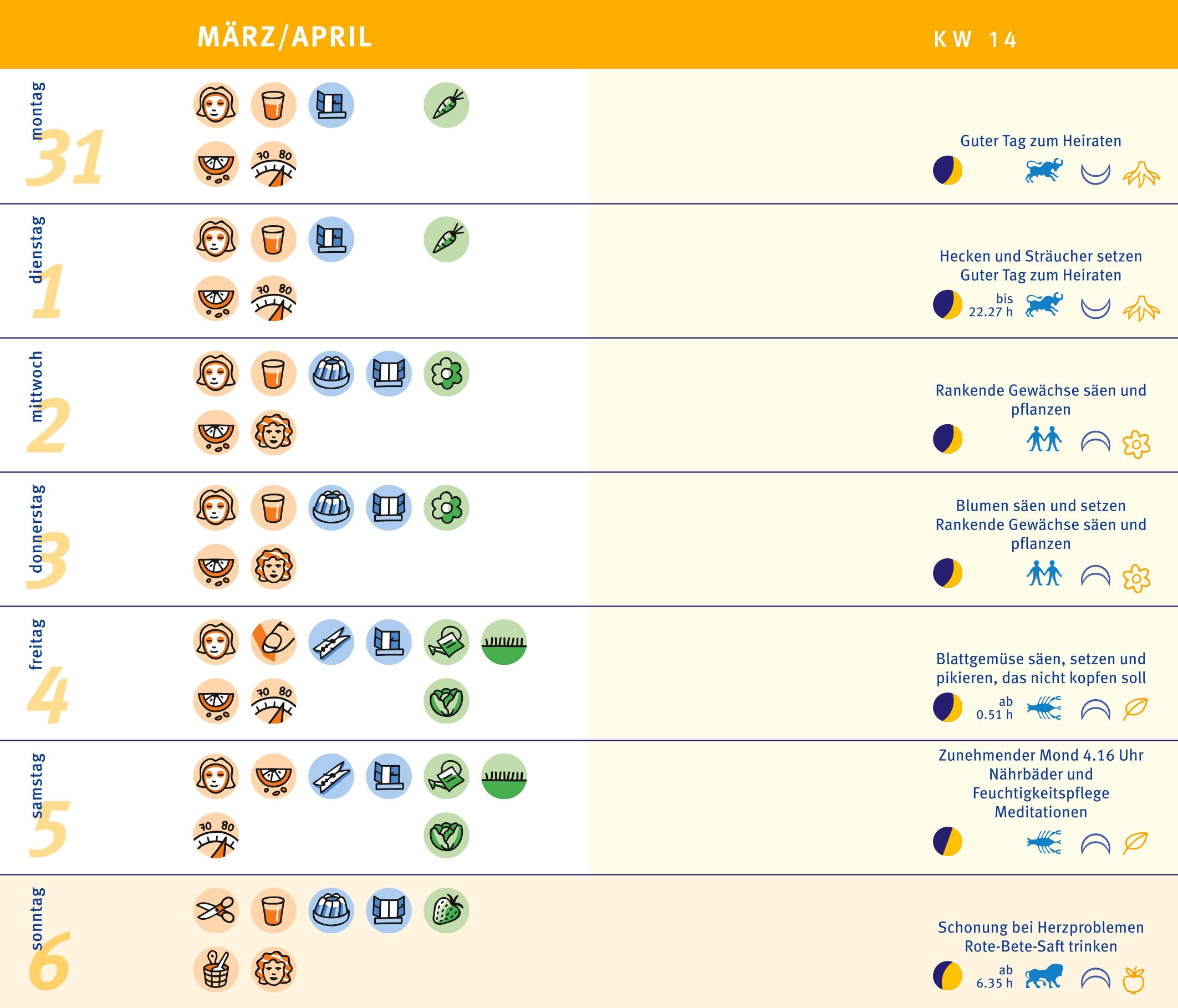 Als täglicher Begleiter bietet er auf einer Doppelseite pro Woche genügend Platz für eigene Notizen und liefert durch die farbigen Symbole rasch die gewünschten Informationen. Für den schnellen Zugriff gibt es am Ende des Kalenders eine praktische Einmerk-Klappe, auf der noch einmal alle Symbole erklärt werden. Bleiben dennoch wichtige Fragen rund um den Mondkalender offen, hilft die Telefon-Hotline kompetent weiter.