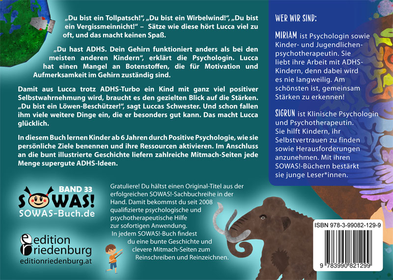 "Du bist ein Tollpatsch!", "Du bist ein Wirbelwind!", "Du bist ein Vergissmeinnicht!" - Sätze wie diese hört Lucca viel zu oft, und das macht keinen Spaß. "Du hast ADHS. Dein Gehirn funktioniert anders als bei den meisten anderen Kindern", erklärt die Psychologin. Lucca hat einen Mangel an Botenstoffen, die für Motivation und Aufmerksamkeit im Gehirn zuständig sind. Damit aus Lucca trotz ADHS-Turbo ein Kind mit ganz viel positiver Selbstwahrnehmung wird, braucht es den gezielten Blick auf die Stärken. "Du bist ein Löwen-Beschützer!", sagt Luccas Schwester. Und schon fallen ihm viele weitere Dinge ein, die er besonders gut kann. Das macht Lucca glücklich.In diesem Buch lernen Kinder ab 6 Jahren durch Positive Psychologie, wie sie persönliche Ziele benennen und ihre Ressourcen aktivieren. Im Anschluss an die bunt illustrierte Geschichte liefern zahlreiche Mitmach-Seiten jede Menge supergute ADHS-Ideen.Gratuliere! Du hältst einen Original-Titel aus der erfolgreichen SOWAS!-Sachbuchreihe in der Hand. Damit bekommst du seit 2008 qualifizierte psychologische und psychotherapeutische Hilfe zur sofortigen Anwendung. In jedem SOWAS!-Buch findest du eine bunte Geschichte und clevere Mitmach-Seiten zum Reinschreiben und Reinzeichnen.Alle SOWAS!-Titel findest du unter www.SOWAS-Buch.deVerlag edition riedenburg Salzburg * editionriedenburg.at *