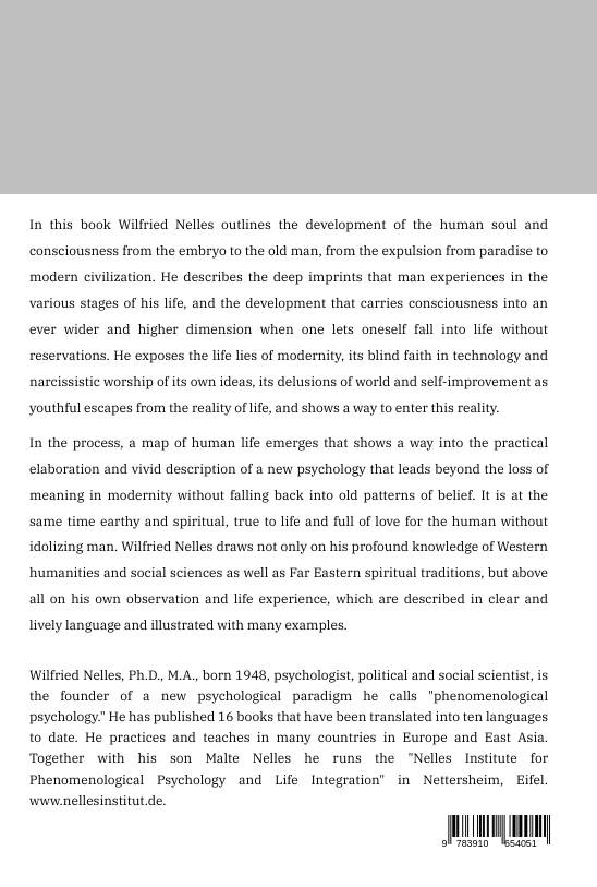 A clear view of the reality of life! Wilfried Nelles outlines in this book the development of the human soul and consciousness from the embryo to the old man, from the expulsion from paradise to modern civilization. He describes the deep imprints that man experiences in the various stages of his life and the development that carries consciousness into an ever wider and higher dimension when one lets oneself fall into life without reservations. He exposes the life lies of modernity, its blind faith in technology and narcissistic worship of its own ideas, its delusions of world and self-improvement as youthful escapes from the reality of life, and shows a way to enter this reality. In the process, a map of human life emerges that leads into the practical elaboration and vivid description of a new psychology that leads beyond the loss of meaning in modernity without falling back into old patterns of belief. It is at the same time earthy and spiritual, true to life and full of love for the human without idolizing man. Nelles relies not only on his profound knowledge of Western humanities and social sciences as well as Far Eastern spiritual traditions, but above all on his own observation and life experience, which are described in clear and lively language and illustrated with many examples.