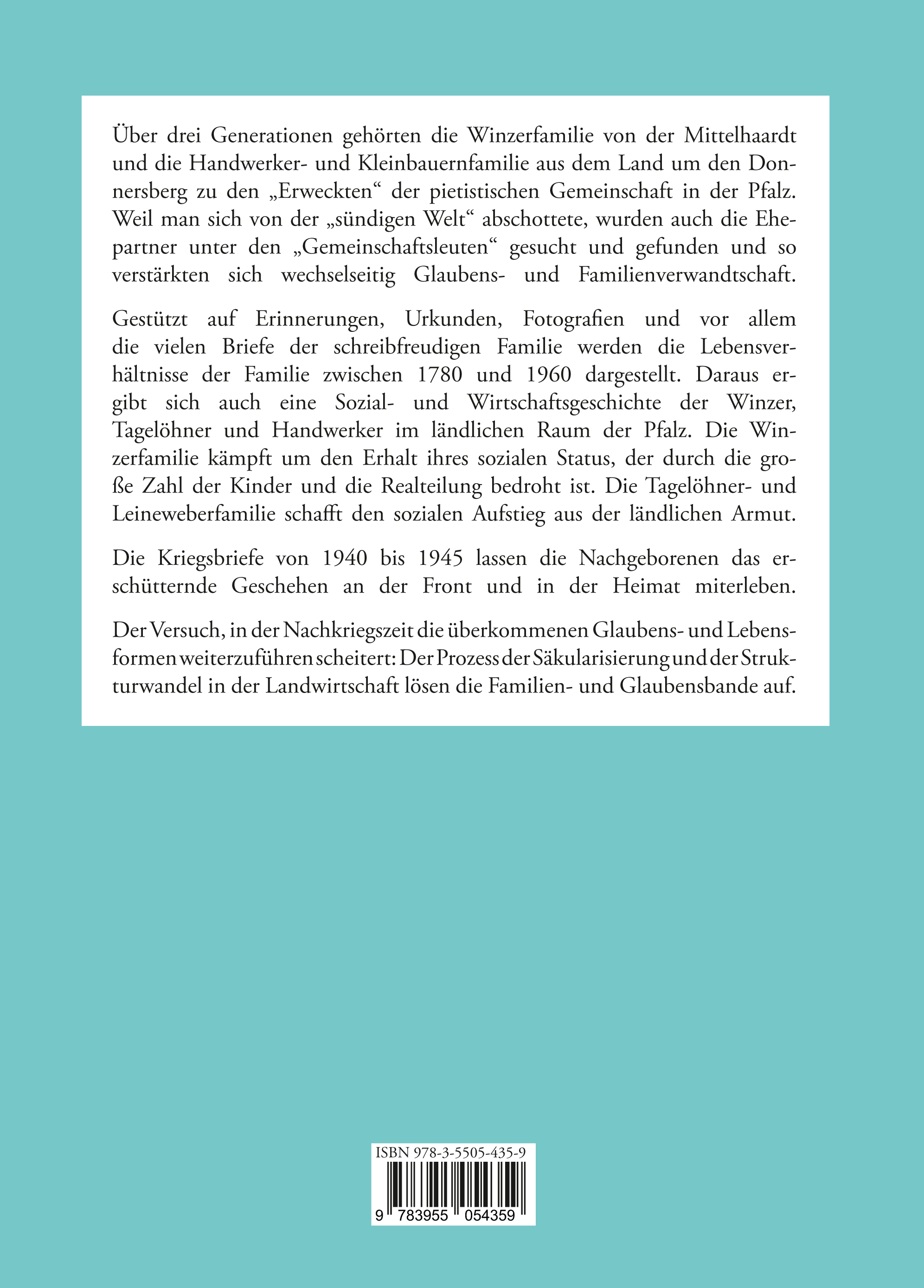 Über drei Generationen gehörten die Winzerfamilie von der Mittelhaardt und die Handwerker- und Kleinbauernfamilie aus dem Land um den Donnersberg zu den "Erweckten" der pietistischen Gemeinschaft in der Pfalz. Weil man sich von der "sündigen Welt" abschottete, wurden auch die Ehepartner unter den "Gemeinschaftsleuten" gesucht und gefunden und so verstärkten sich wechselseitig Glaubens- und Familienverwandtschaft. Gestützt auf Erinnerungen, Urkunden, Fotografien und vor allem die vielen Briefe der schreibfreudigen Familie werden die Lebensverhältnisse der Familie zwischen 1780 und 1960 dargestellt. Daraus ergibt sich auch eine Sozial- und Wirtschaftsgeschichte der Winzer, Tagelöhner und Handwerker im ländlichen Raum der Pfalz. Die Winzerfamilie kämpft um den Erhalt ihres sozialen Status, der durch die große Zahl der Kinder und die Realteilung bedroht ist. Die Tagelöhner- undLeineweberfamilie schafft den sozialen Aufstieg aus der ländlichen Armut.Die Kriegsbriefe von 1940 bis 1945 lassen die Nachgeborenen das erschütternde Geschehen an der Front und in der Heimat miterleben. Der Versuch, in der Nachkriegszeit die überkommenen Glaubens- und Lebensformen weiterzuführen scheitert: Der Prozess der Säkularisierung und der Strukturwandel in der Landwirtschaft lösen die Familien- und Glaubensbande auf.