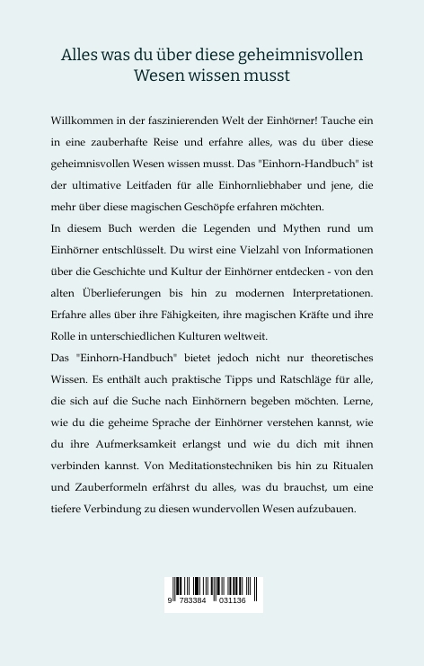 In diesem Buch werden die Legenden und Mythen rund um Einhörner entschlüsselt. Du wirst eine Vielzahl von Informationen über die Geschichte und Kultur der Einhörner entdecken - von den alten Überlieferungen bis hin zu modernen Interpretationen. Erfahre alles über ihre Fähigkeiten, ihre magischen Kräfte und ihre Rolle in unterschiedlichen Kulturen weltweit.