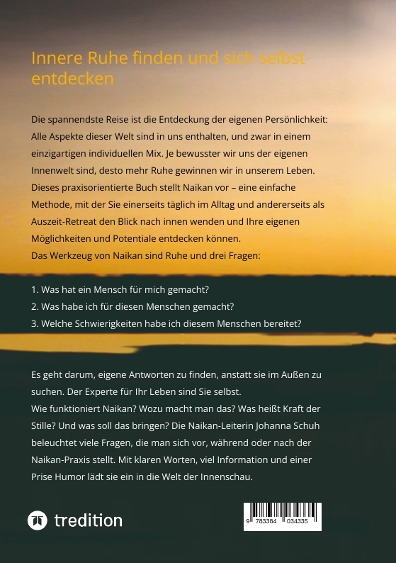 Innenschau bedeutet zur Ruhe kommen in einer bewegten Welt. Die spannendste Reise ist die Entdeckung der eigenen Persönlichkeit: Alle Aspekte dieser Welt sind in uns enthalten, und zwar in einem einzigartigen individuellen Mix. Je bewusster wir uns der eigenen Innenwelt sind, desto mehr Ruhe gewinnen wir in unserem Leben. Dieses praxisorientierte Buch stellt Naikan vor - eine einfache Methode, mit der Sie einerseits täglich im Alltag und andererseits als Auszeit-Retreat den Blick nach innen wenden und Ihre eigenen Möglichkeiten und Potentiale entdecken können. Das Werkzeug von Naikan sind Ruhe und drei Fragen: 1. Was hat ein Mensch für mich gemacht? 2. Was habe ich für diesen Menschen gemacht? 3. Welche Schwierigkeiten habe ich diesem Menschen bereitet? Es geht darum, eigene Antworten zu finden, anstatt sie im Außen zu suchen. Der Experte für Ihr Leben sind Sie selbst. Wie funktioniert Naikan? Wozu macht man das? Was heißt Kraft der Stille? Und was soll das bringen? Die Naikan-Leiterin Johanna Schuh beleuchtet viele Fragen, die man sich vor, während oder nach der Naikan-Praxis stellt. Mit klaren Worten, viel Information und einer Prise Humor lädt sie ein in die Welt der Innenschau.