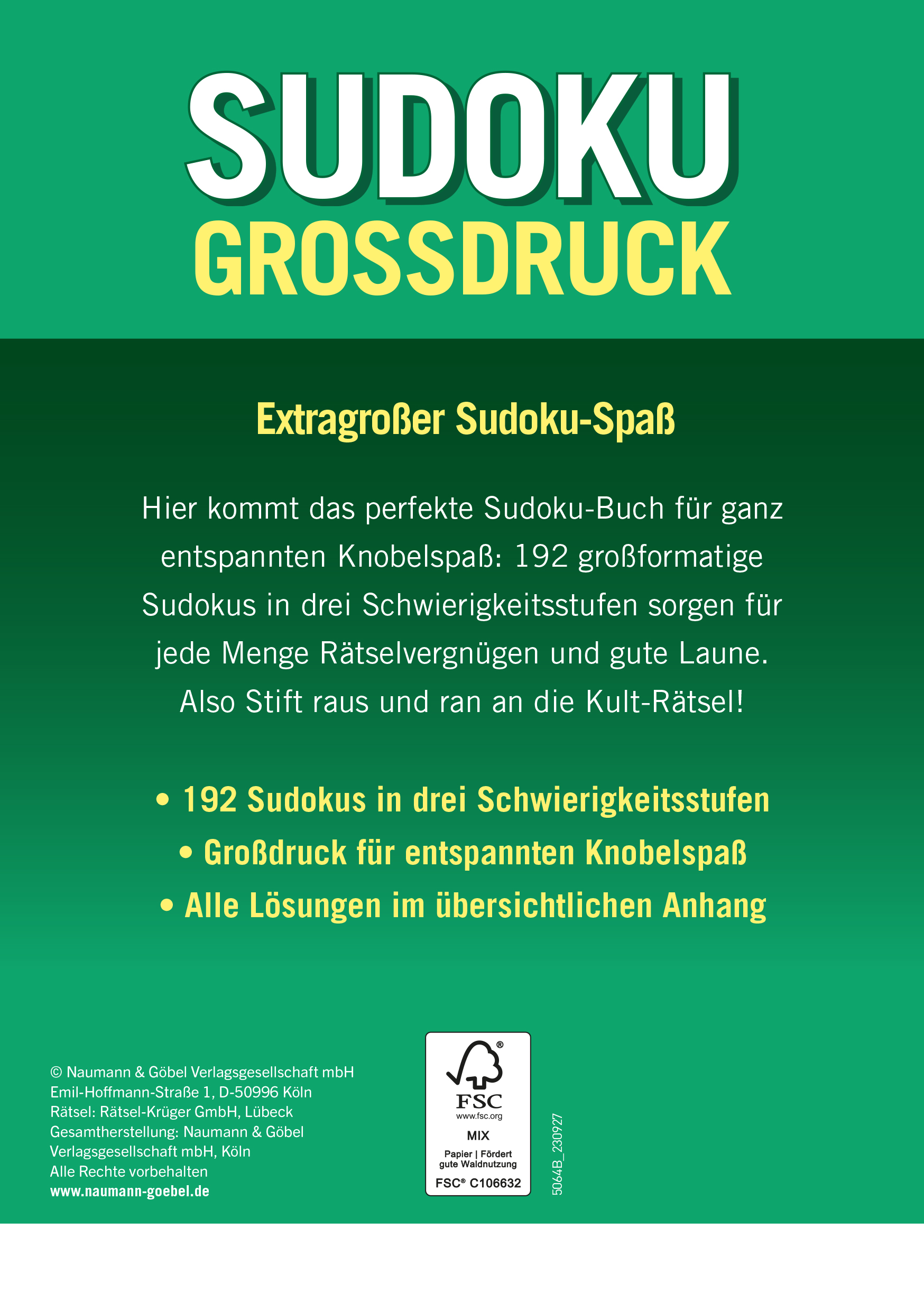 Genial einfach und doch verflixt schwierig - Sudoku ist ein Knobelspaß der Extraklasse. Hier kommt das perfekte Sudoku-Buch für ganz entspanntes Rätselvergnügen: Freuen Sie sich auf 192 Sudokus in augenfreundlichem Großdruck, mit dem Sie beim Lösen der magischen Zahlenquadrate immer den Durchblick behalten. Mit den drei Schwierigkeitsstufen in aufsteigender Reihenfolge können Sie Ihre Sudoku-Skills testen und nach und nach verbessern. So werden Sie mit Köpfchen und Kombinationsgabe im Handumdrehen zum wahren Sudoku-Meister. Also Stift raus und ran an die Kult-Rätsel!