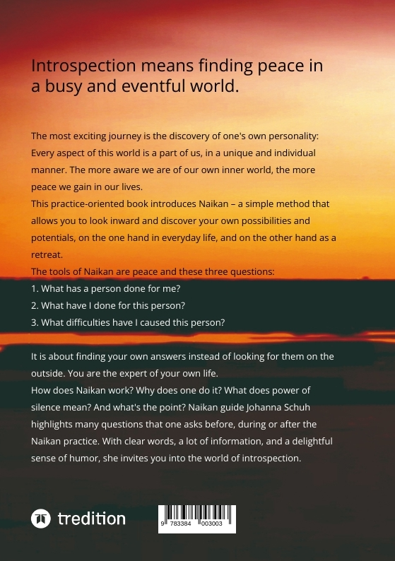 Introspection means finding peace in a busy and eventful world. The most exciting journey is the discovery of one's own personality: Every aspect of this world is a part of us, in a unique and individual manner. The more aware we are of our own inner world, the more peace we gain in our lives. This practise-oriented book introduces Naikan - a simple method that allows you to look inward and discover your own possibilities and potentials, on the one hand in everyday life, and on the other hand as a retreat. The tools of Naikan are peace and these three questions: 1. What has a person done for me? 2. What have I done for this person? 3. What difficulties have I caused this person? It is about finding your own answers instead of looking for them on the outside. You are the expert of your own life. How does Naikan work? Why does one do it? What does power of silence mean? And what's the point? Naikan guide Johanna Schuh highlights many questions that one asks before, during or after the Naikan practice. With clear words, a lot of information, and a delightful sense of humor, she invites you into the world of introspection.