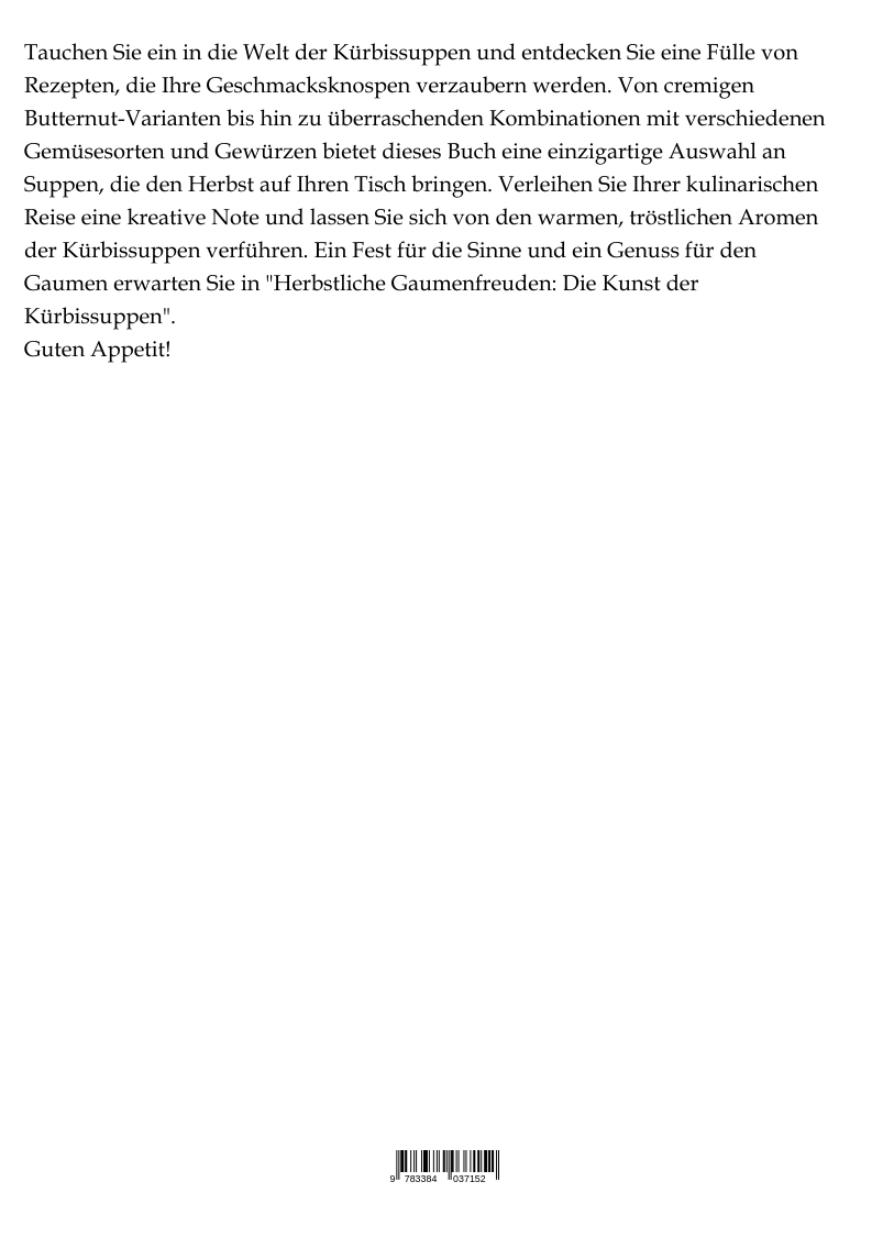Tauchen Sie ein in die Welt der Kürbissuppen und entdecken Sie eine Fülle von Rezepten, die Ihre Geschmacksknospen verzaubern werden. Von cremigen Butternut-Varianten bis hin zu überraschenden Kombinationen mit verschiedenen Gemüsesorten und Gewürzen bietet dieses Buch eine einzigartige Auswahl an Suppen, die den Herbst auf Ihren Tisch bringen. Verleihen Sie Ihrer kulinarischen Reise eine kreative Note und lassen Sie sich von den warmen, tröstlichen Aromen der Kürbissuppen verführen. Ein Fest für die Sinne und ein Genuss für den Gaumen erwarten Sie in "Herbstliche Gaumenfreuden: Die Kunst der Kürbissuppen".Guten Appetit!