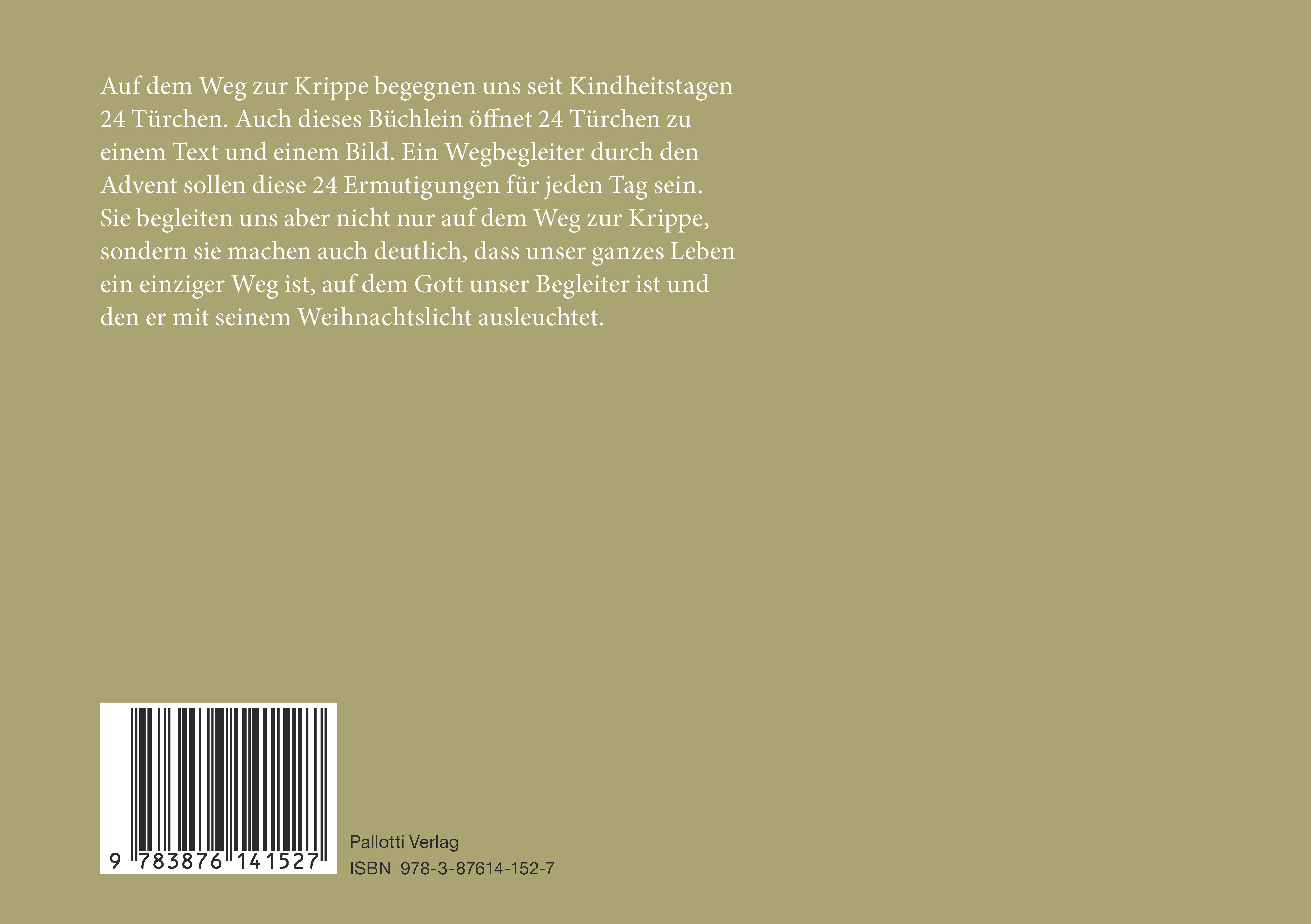 Auf dem Weg zur Krippe begegnen uns seit Kindheitstagen 24 Türchen. Auch dieses Büchlein öffnet 24 Türchen zu einem Text und einem Bild. Ein Wegbegleiter durch den Advent sollen diese 24 Ermutigungen für jeden Tag sein. Sie begleiten uns aber nicht nur auf dem Weg zur Krippe, sondern sie machen auch deutlich, dass unser ganzes Leben ein einziger Weg ist, auf dem Gott unser Begleiter ist und den er mit seinem Weihnachtslicht ausleuchtet.